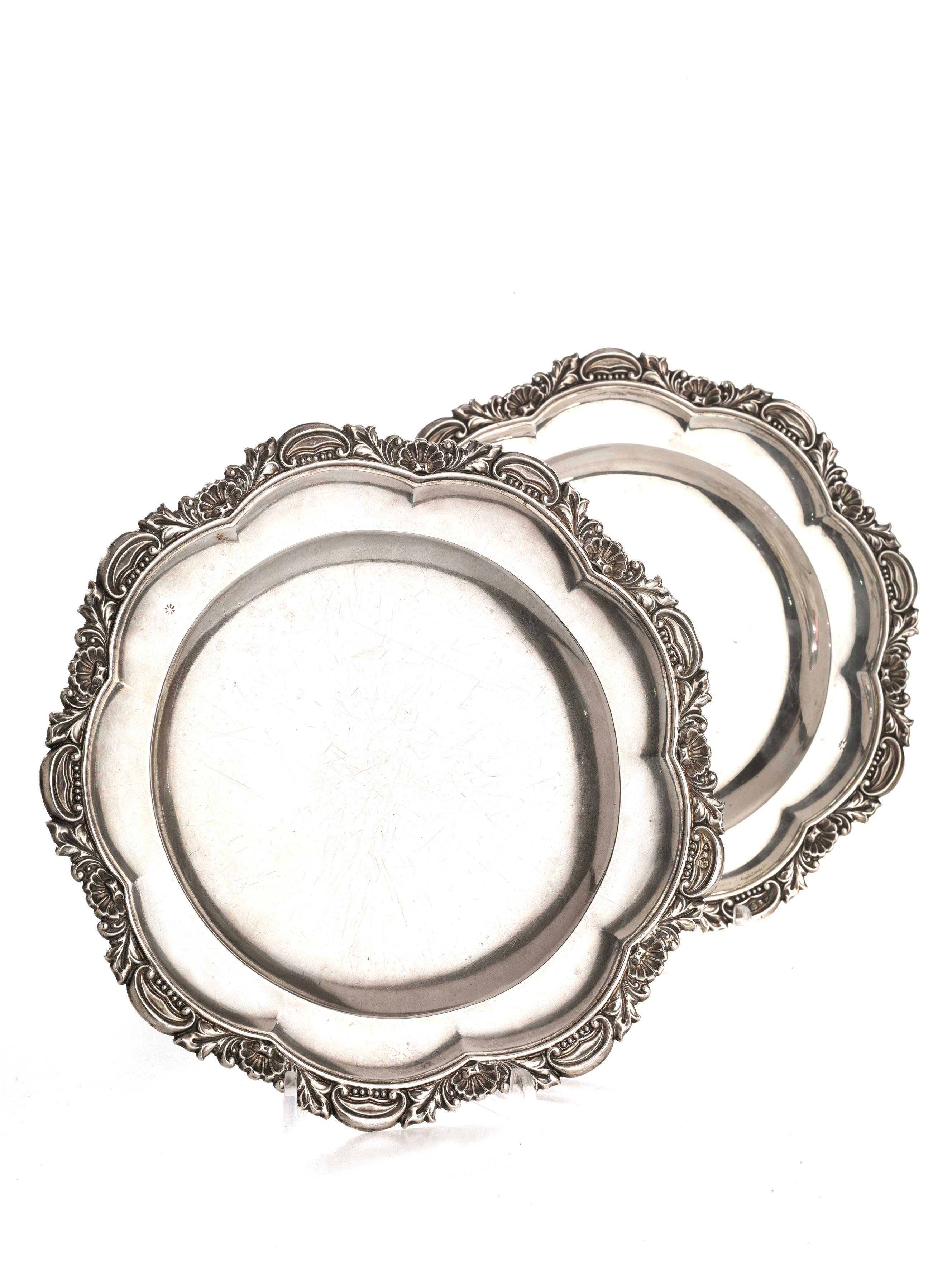 in argento con bordo sagomato e sbalzato a volute, diam. cm 25, g 790 (2)