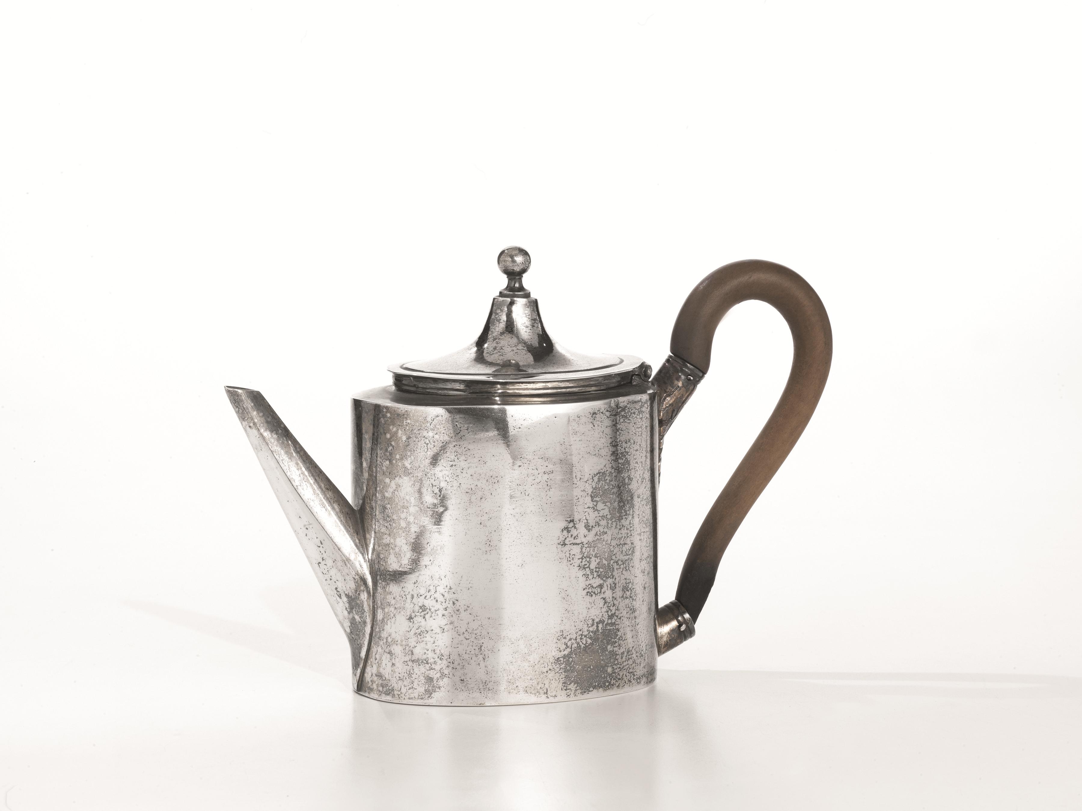 in argento, corpo liscio, coperchio con presa a sfera, manico in legno ebanizzato, g 625, alt. cm 14,5