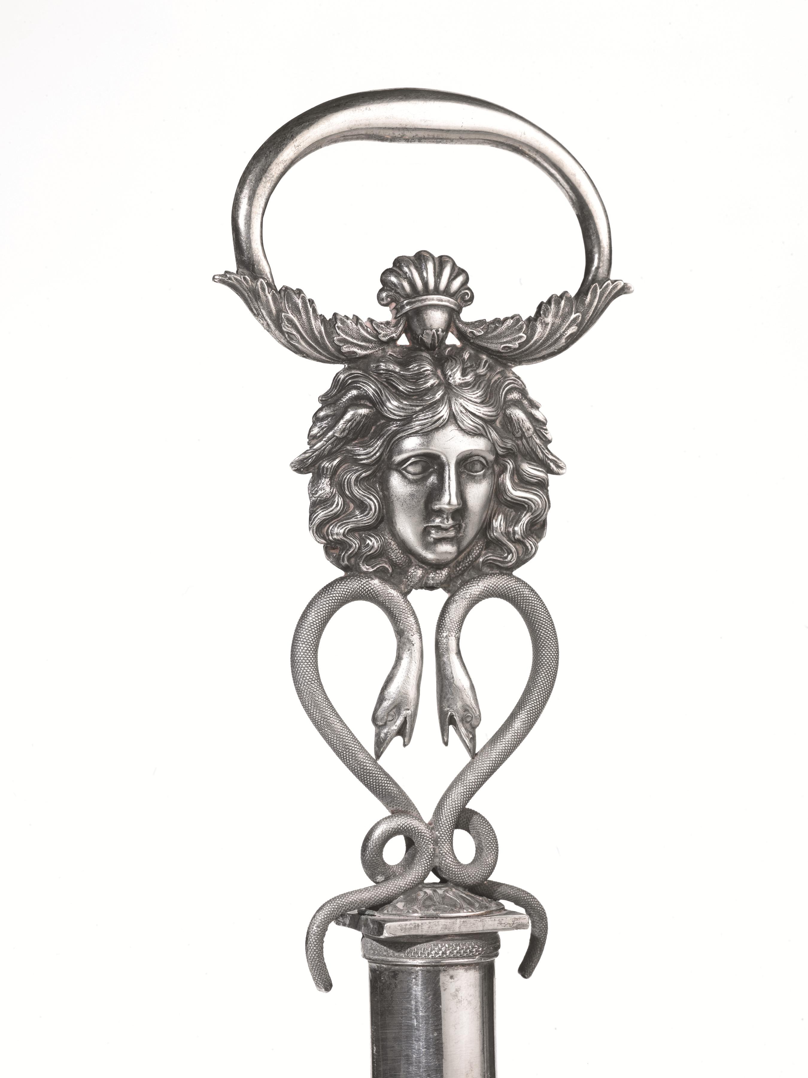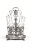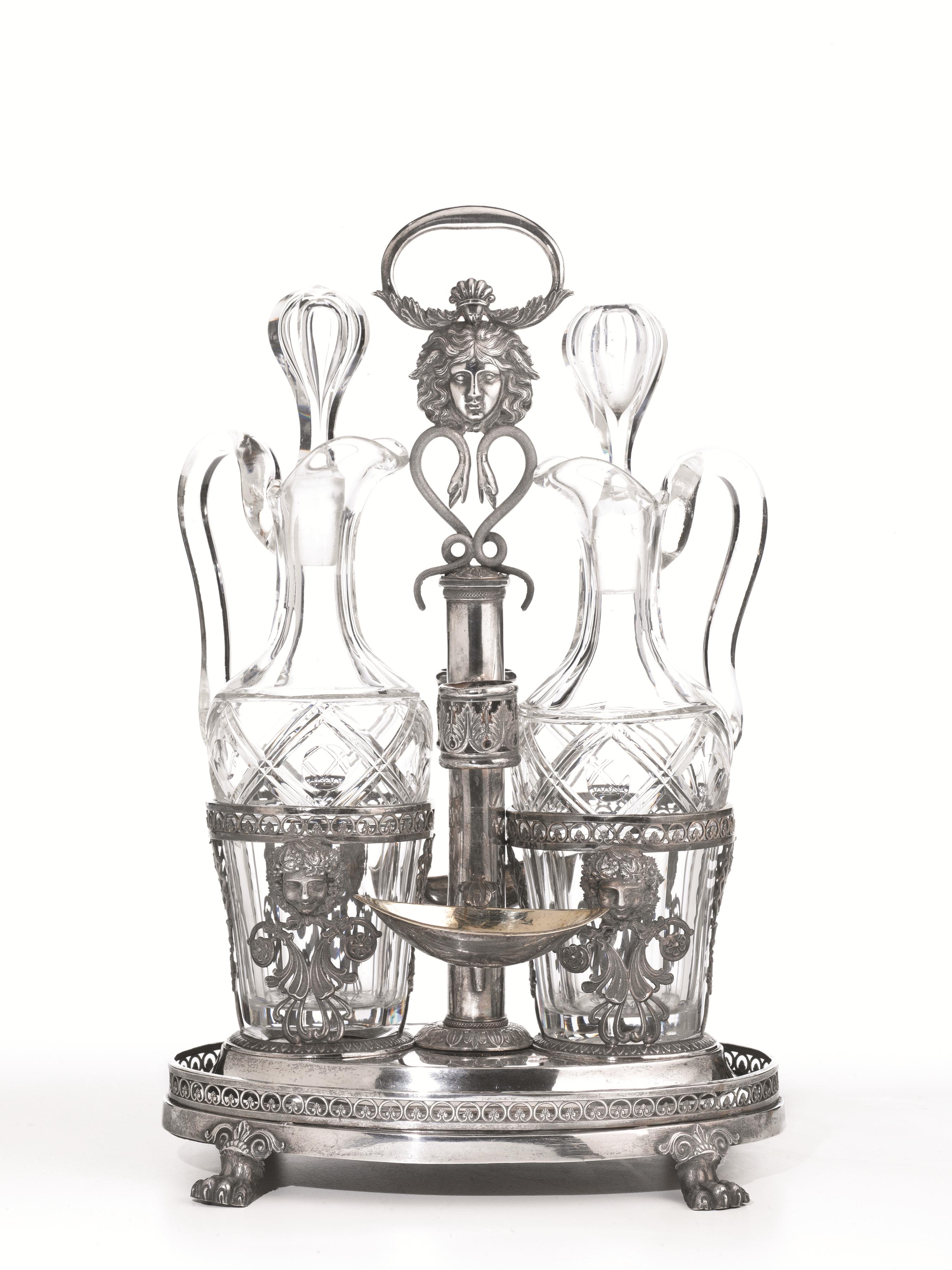 in argento, base ovale su quattro piedini a zampa ferina, porta ampolle con sostegni realizzati da teste di Bacco e volute, due saliere a navette, presa con finale a mascherone, alt. cm 34, g 740, lievi danni