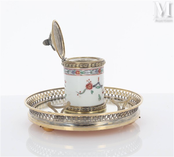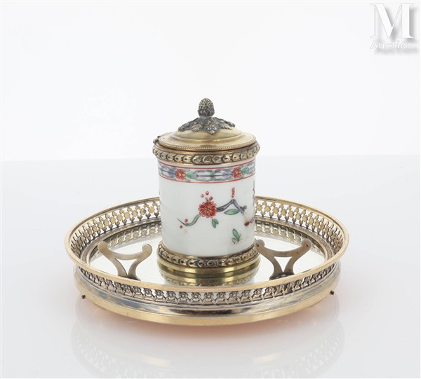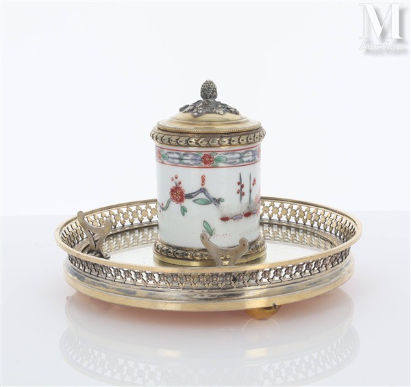 In porcellana smaltata nello stile del Kakiemon, cornice in argento con porta pennino, fondo del vassoio ricoperto da uno specchio di vetro.