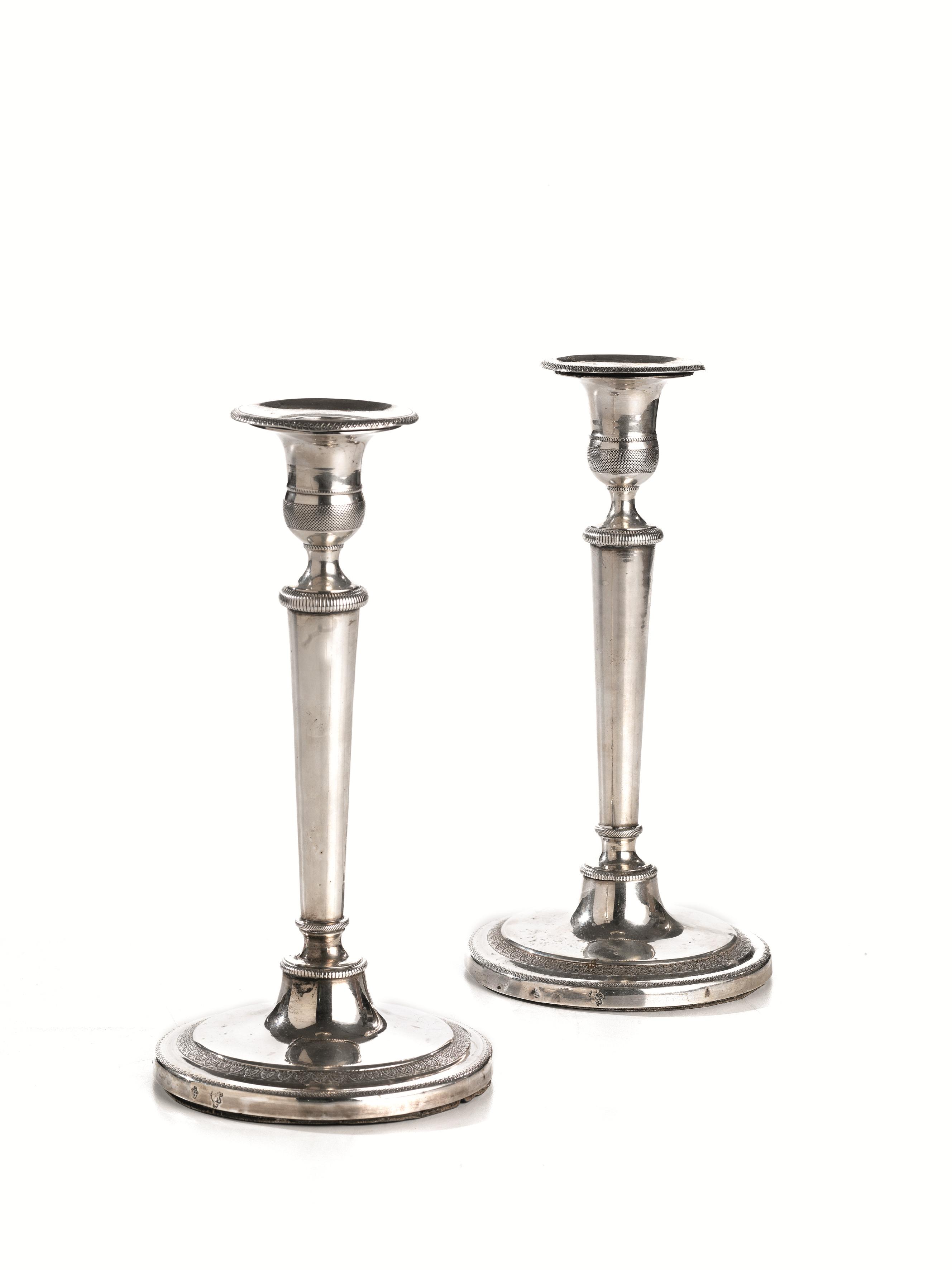 COPPIA DI CANDELIERI, TORINO, FINE SEC. XVIII-INIZI SEC. XIX, SAGGIATORE...