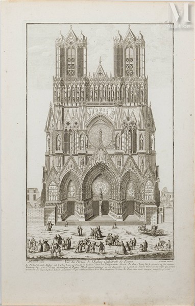 Mention inscrite en pied : "Le portail de cette église est le plus beau qu'il y ait en France. Tous les Rois y sont sacrés. Le roi Clovis fut le premier et fut nommé Louis en 542 par Saint Remy, archevêque de Reims. L'huile ayant manqué, on vit descendre sur l'autel un pigeon blanc comme neige qui portait en son bec une ampoule pleine d'huile surnommée Sainte, qui servit au Sacre de ce Roi et qui sert à tous les Rois sans avoir manqué jusqu'à présent".