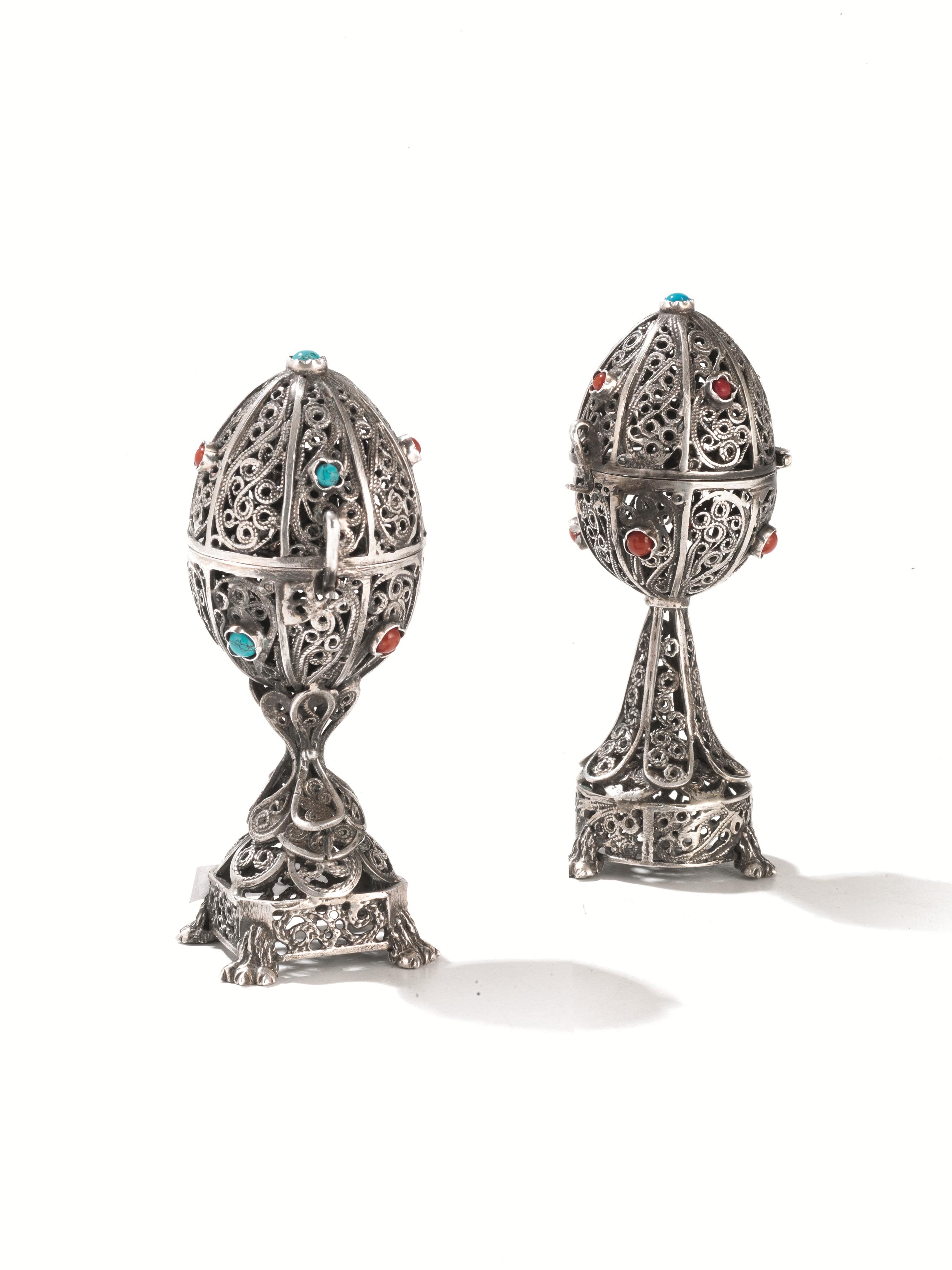 COPPIA DI PORTA INCENSO, MOSCA, 1873in filigrana d’argento, argento e...