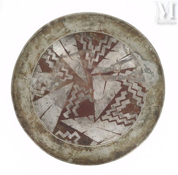 Plat circulaire creux en dinanderie à décor géométrique argenté de lignes brisées et pointes sur fond cuivre.