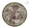 Piatto circolare cavo in ottone con decorazione geometrica in argento di linee spezzate e punti su fondo rame.