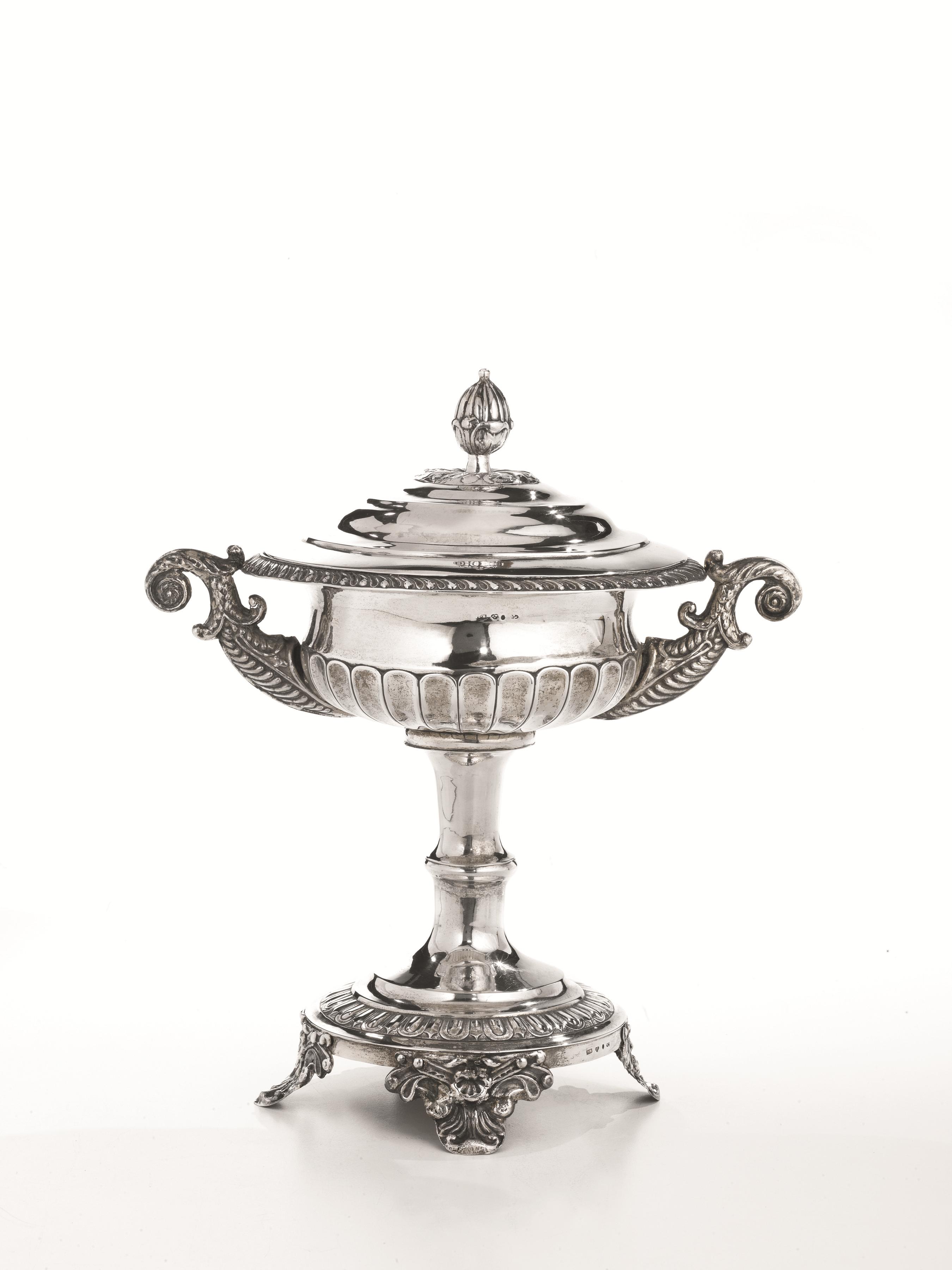 in argento, bordo sbalzato, due anse a volute, base circolare su quattro piedini a motivi fogliacei, presa del coperchio modellata a pigna, alt. cm 28, g 720