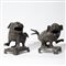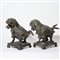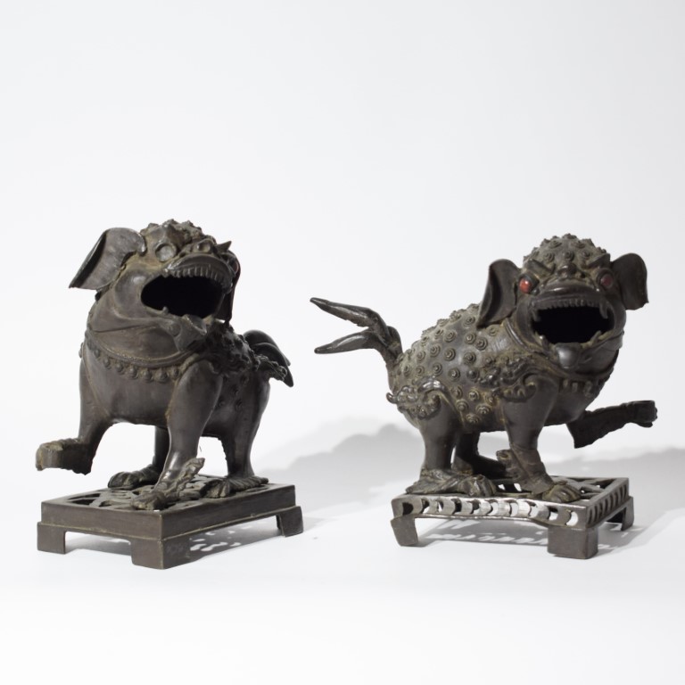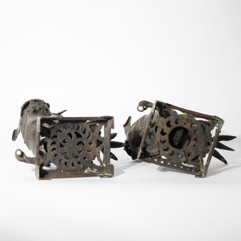 A pair of Buddhist lion-shaped stick holders on a square pierced base.