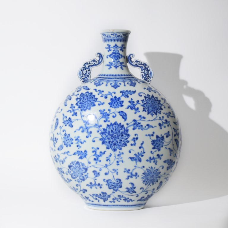 A Ming style blue and white moon flask with lotus scroll decoration.