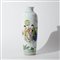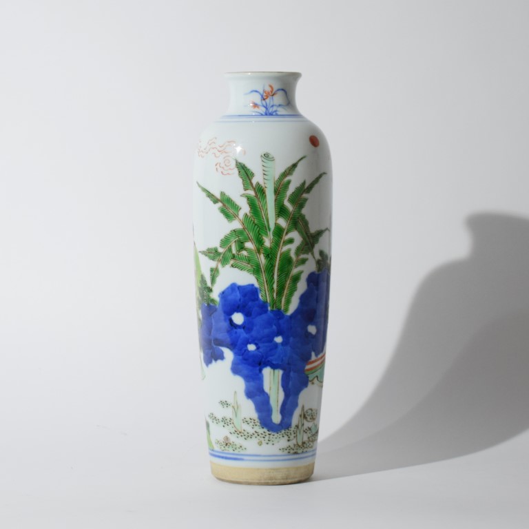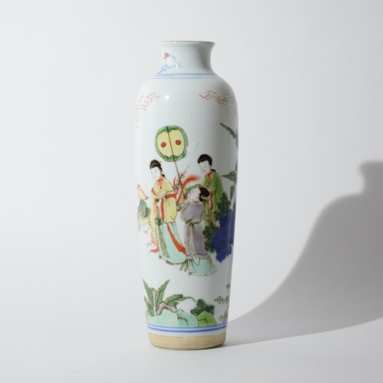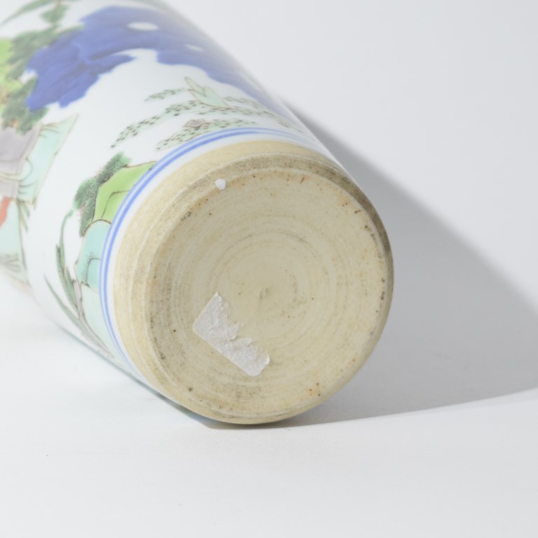 Heavy potted porcelain body decorated with courtly scene in a garden. Unglazed foot.