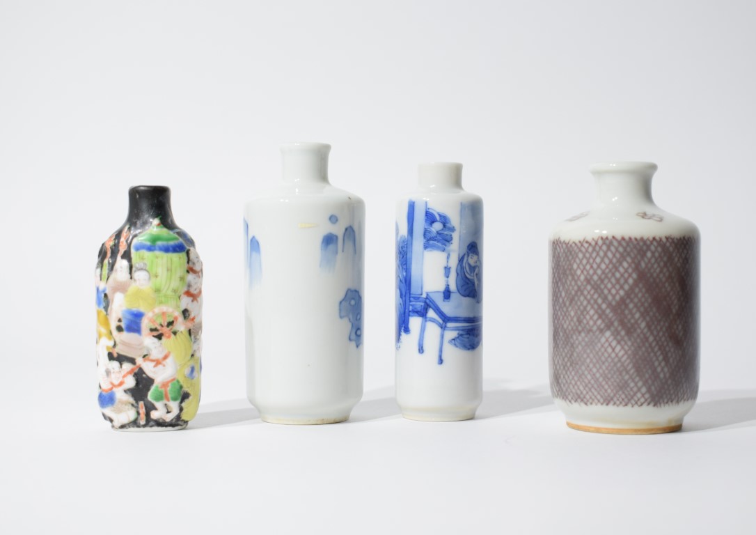 Three cylindrical porcelain snuff bottles with underglaze blue mark of Yongzheng and one moulded porcelain snuff bottle with iron red mark on the bottom.