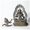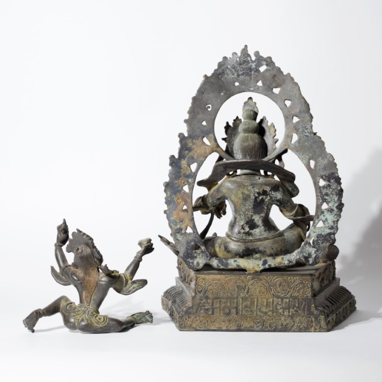 The image of the Manjushri seated on a complex throne sourrounded by the flame and a smaller image of Dakini.