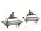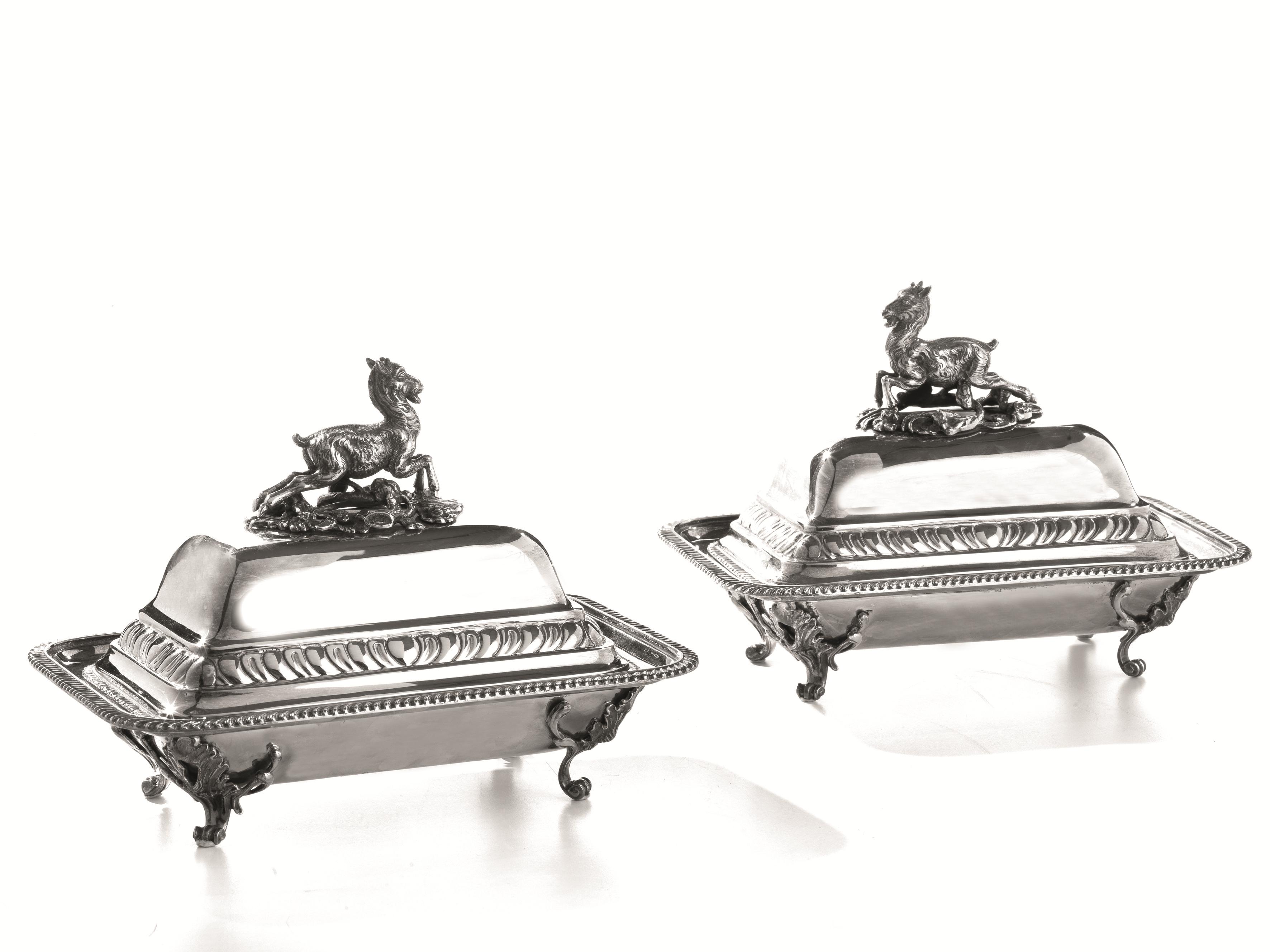 in argento di forma rettangolare con bordi baccellati, presa dei coperchi modellati a caprette, cm 18,5x26,5 (2)