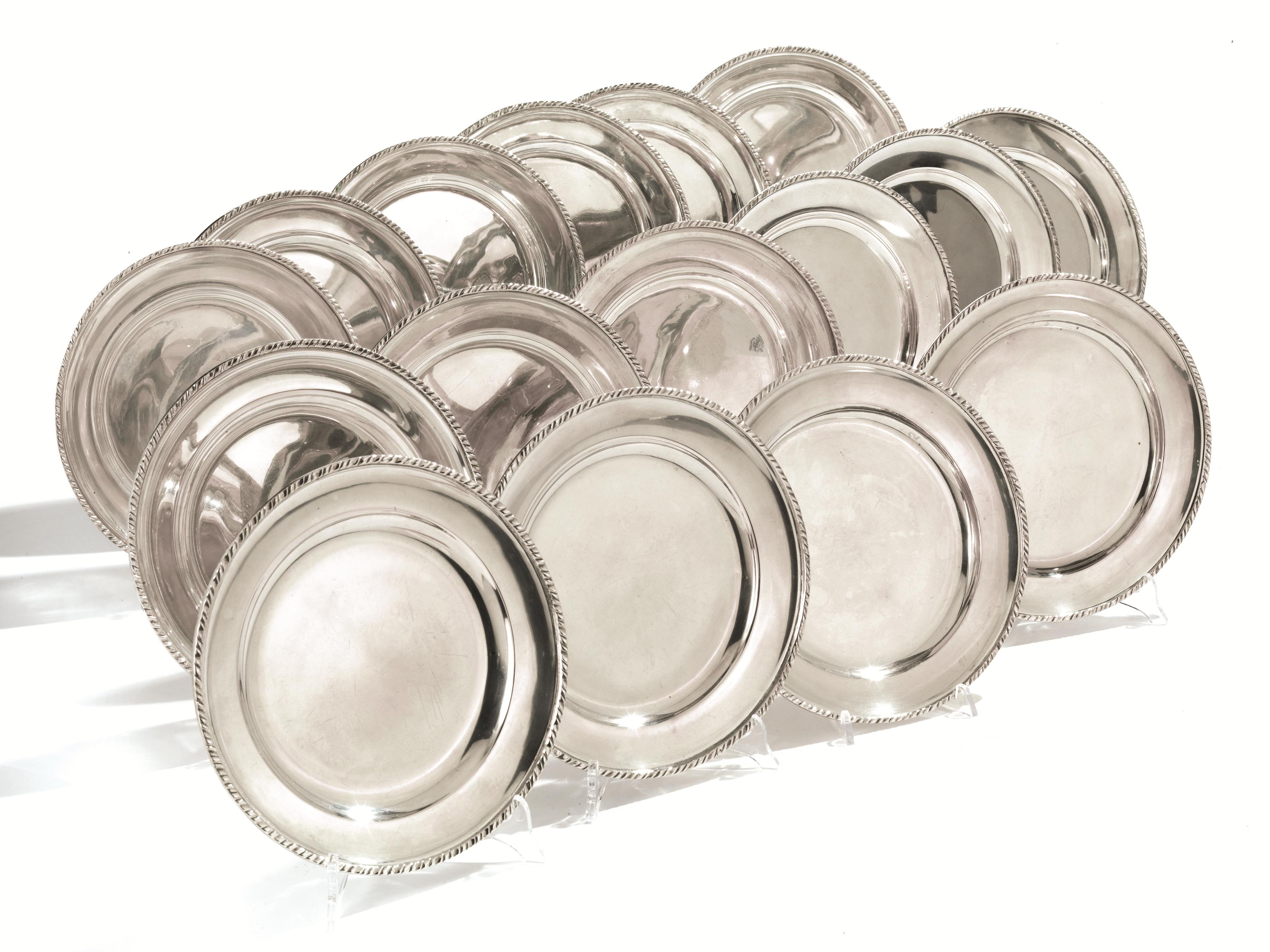 Lotto 570 | SEDICI PIATTI, SEC. XXin argento con bordo a cordonetto, diam. cm 23, g 6740...