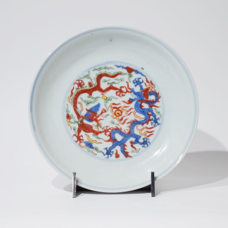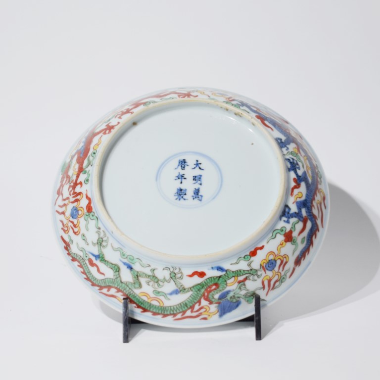 White porcelain decorated in five colours palette, with dragons chasing the flaming pearl. On the bottom double encircled six-character mark of Wanli.