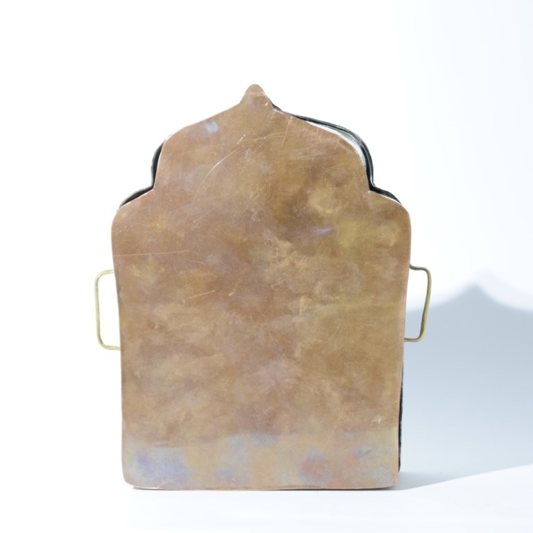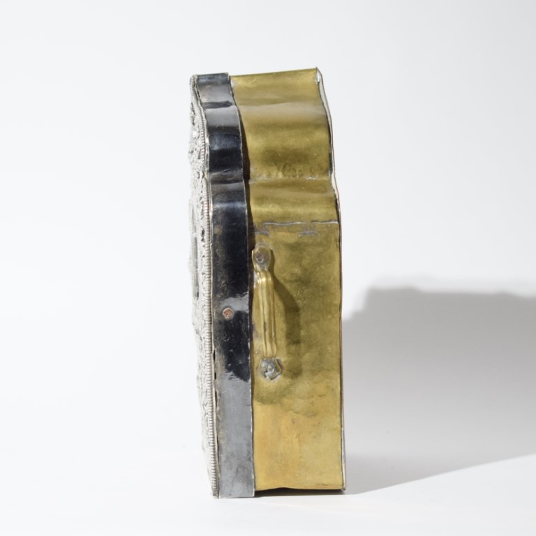 Brass and copper box with embossed silver cover with eight Buddhist symbols.