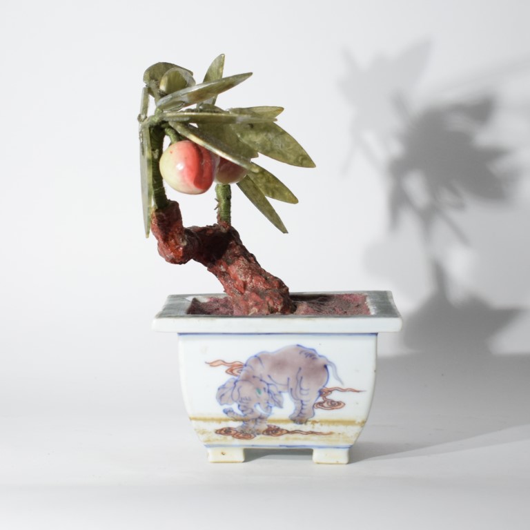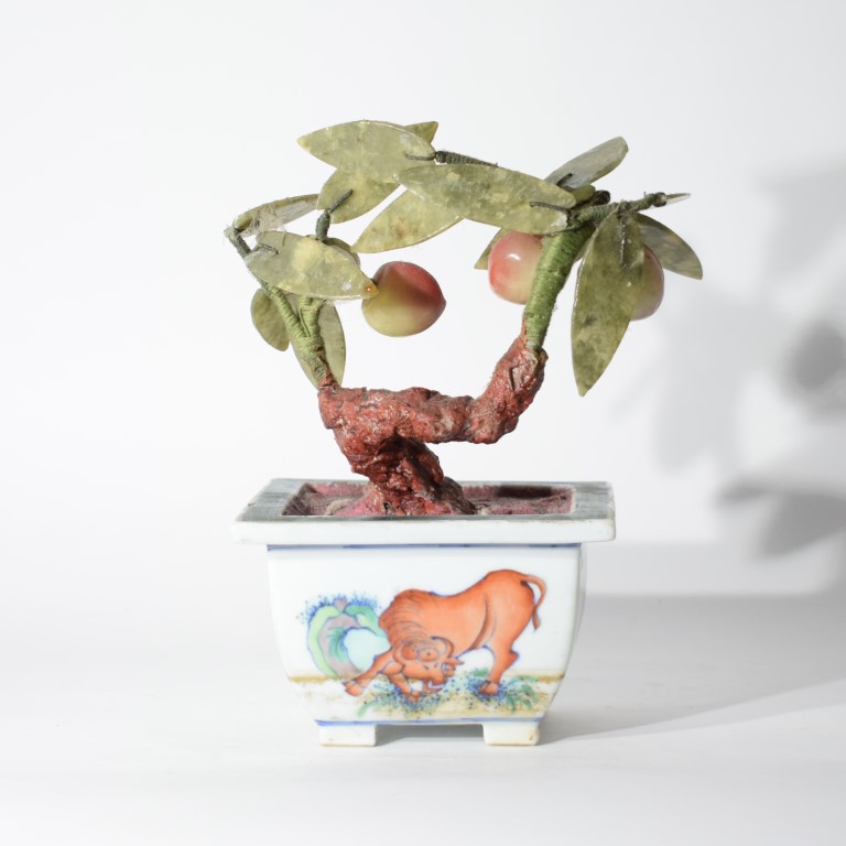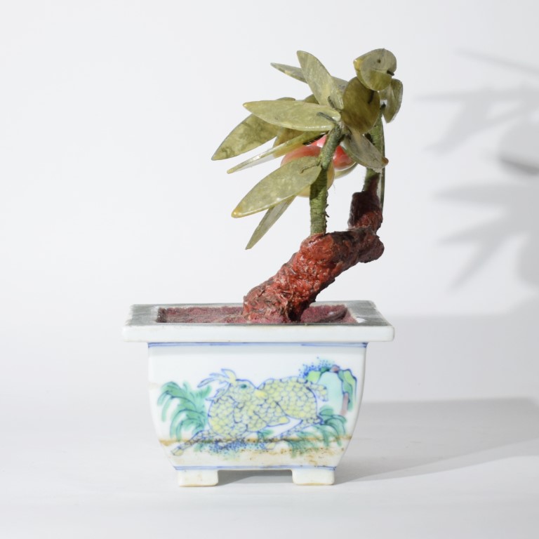 Quadrangular porcelain vase containing a fake hardstone peach tree.