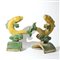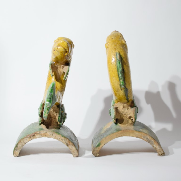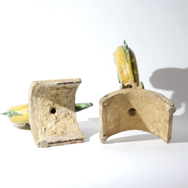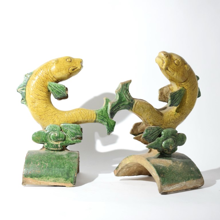 A pair of yellow and green roof tiles shaped in form of two carps.