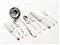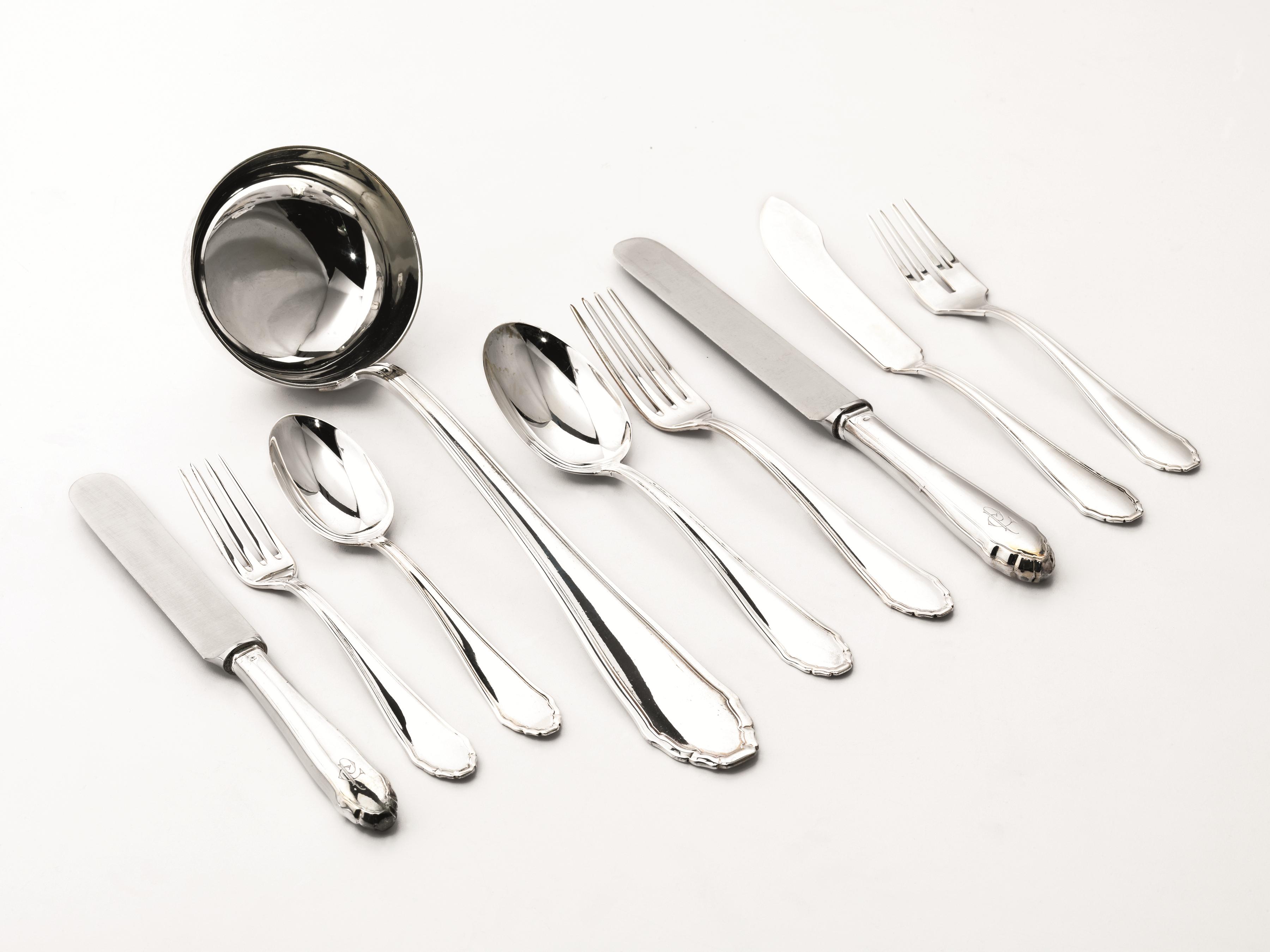 Composizione: 12 forchette; 12 coltelli; 12 cucchiai; 12 forchette frutta; 12 coltelli frutta, 12 cucchiai frutta; 12 forchette e 12 coltelli da pesce, 5 posate da portata e 9 cucchiaini da caffè non pertinenti