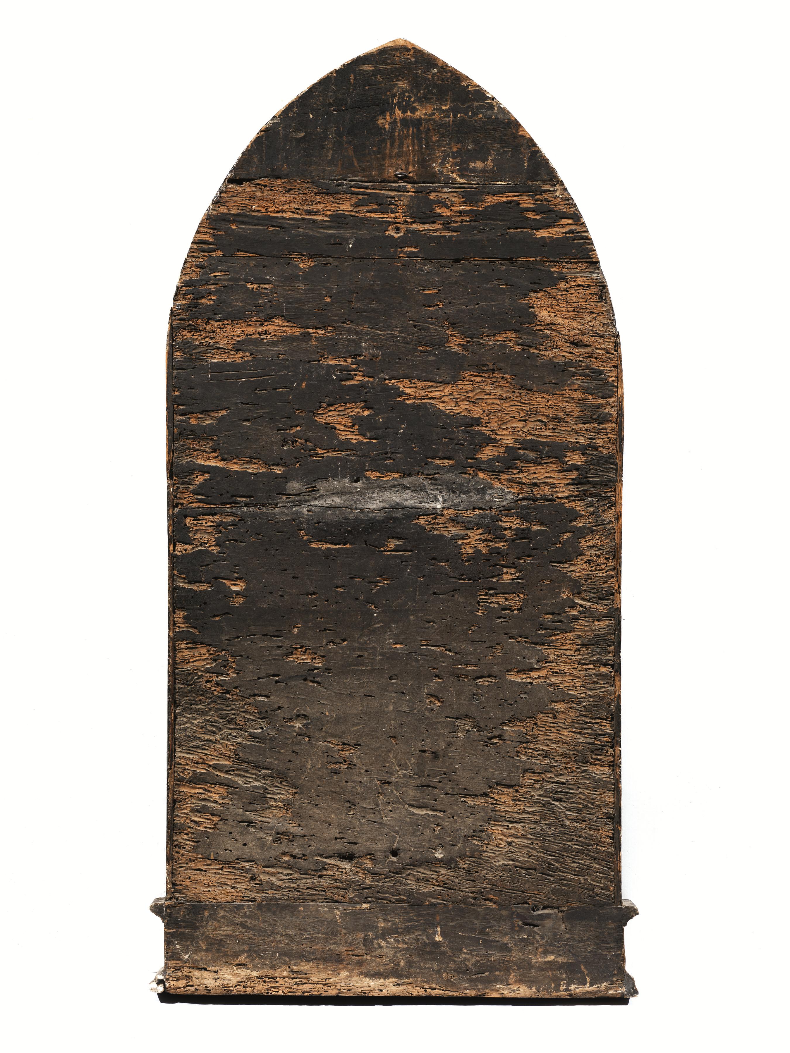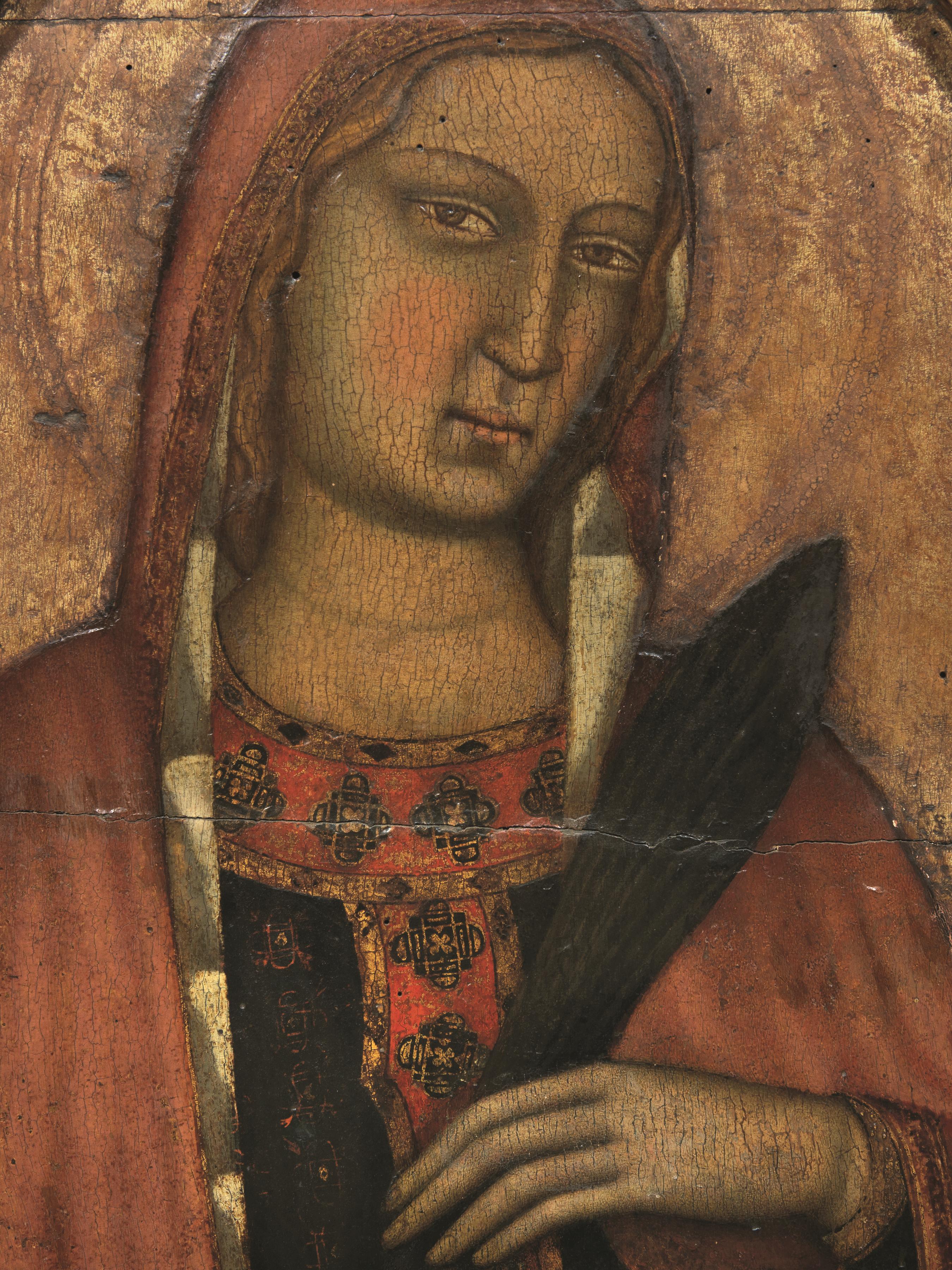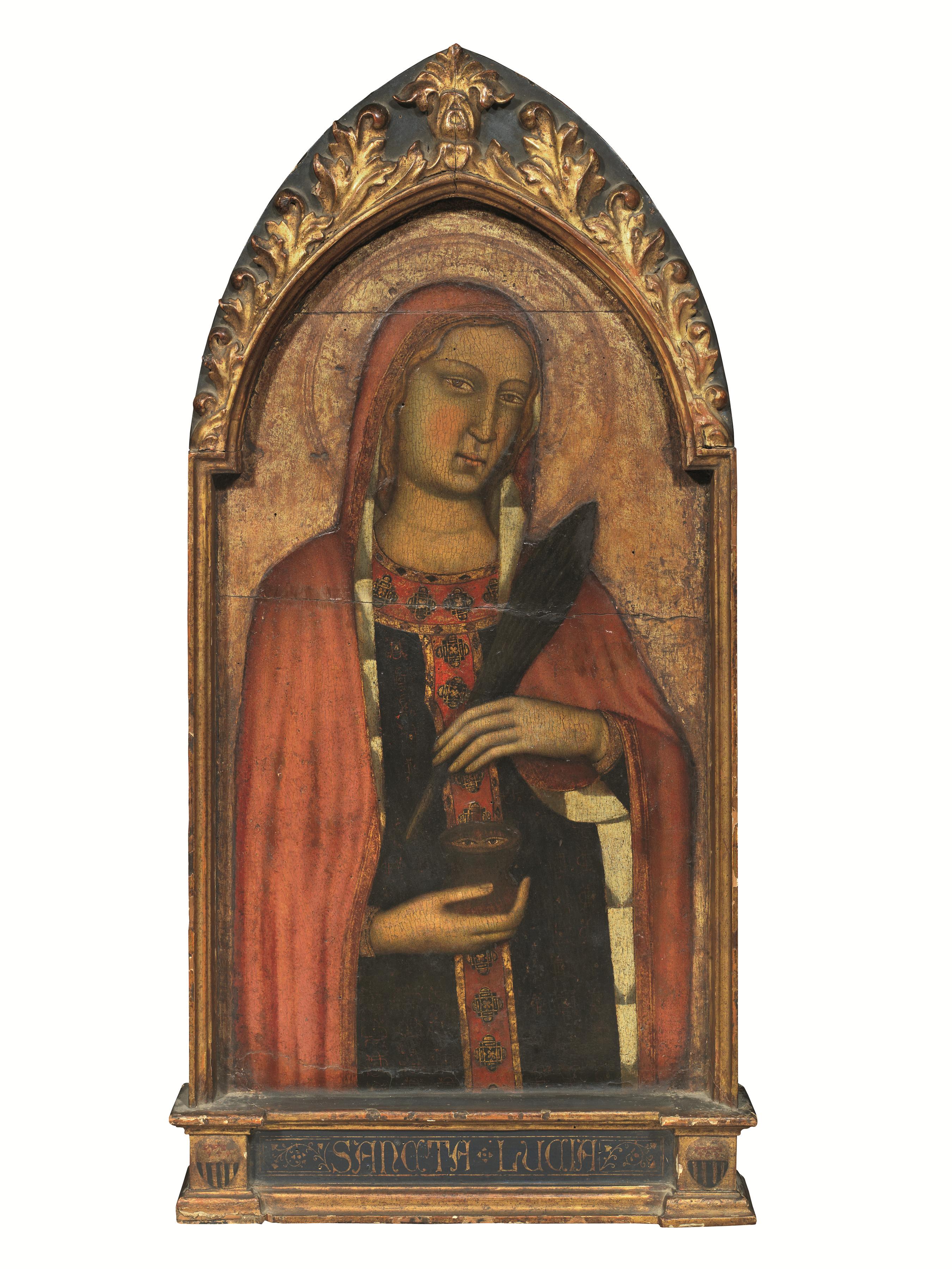 tempera su tavola fondo oro centinata, cm 75,5x42,5 con cornice di epoca posteriore intagliata a motivo fogliato sulla cuspide, dorata e laccata, cm 98x50 sulla base a gradino iscrizione: "SANCTA LUCIA" e ai lati due stemmi nobiliari
