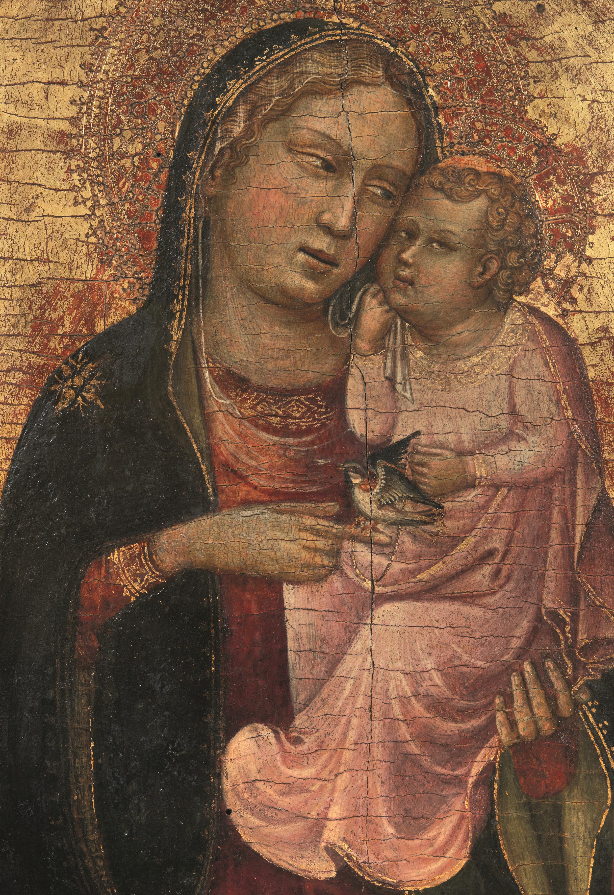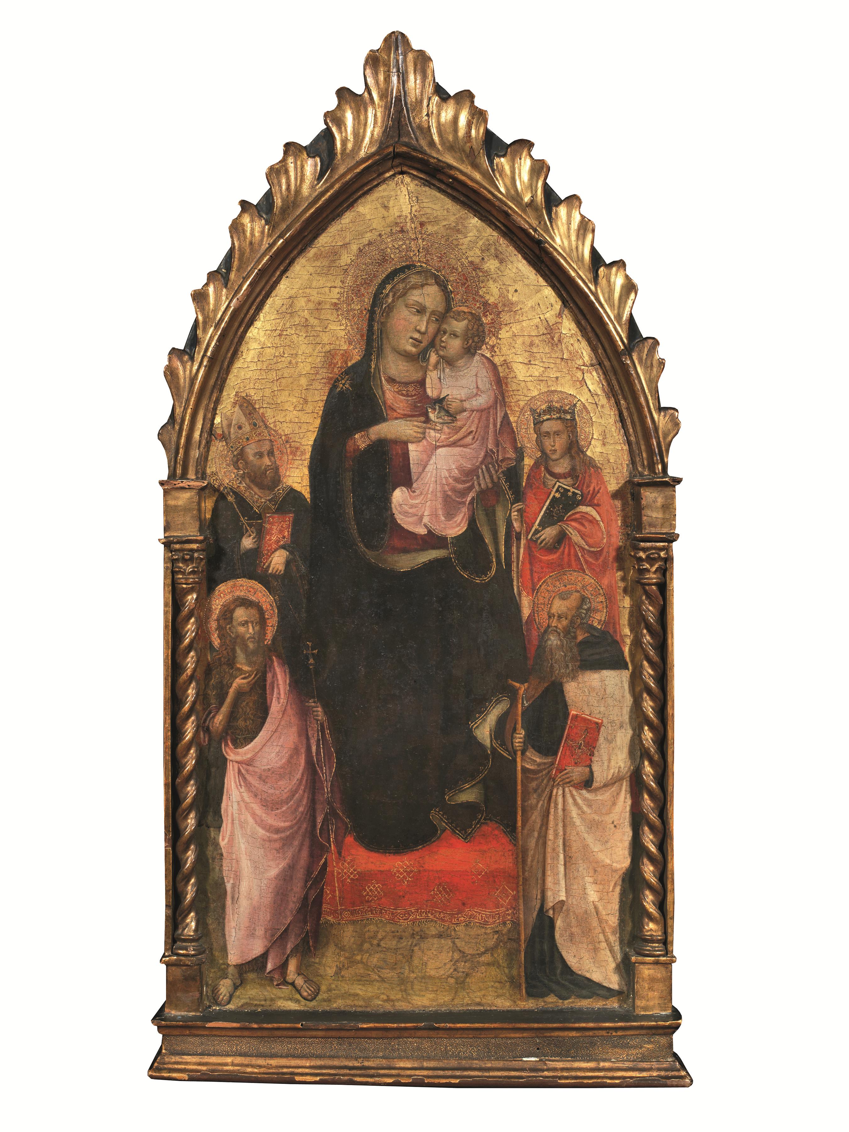 Il fondo oro qui proposto raffigurante la Madonna con Bambino e santi risulta documentato presso la Fototeca della Fondazione Zeri di Bologna come opera del Maestro di Montefloscoli e come si può dedurre dalle dimensioni doveva avere in origine la funzione di piccola anconetta per la devozione privata.
