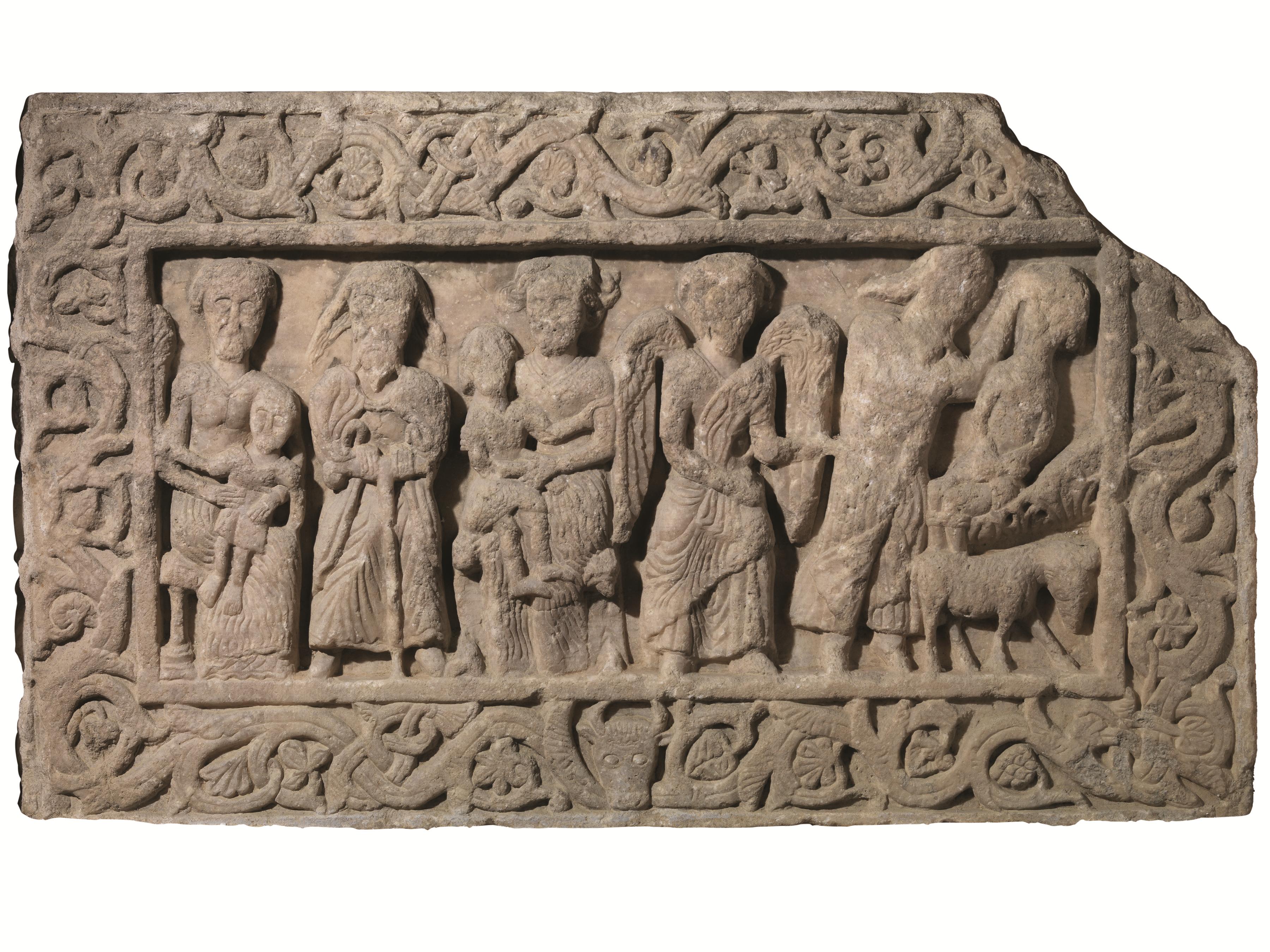 La lastra, che costituiva probabilmente uno dei pannelli figurati dell'antico pulpito della pieve, è delimitata da una caratteristica fascia a girali con palmette e una protome bovina collocata al centro in basso che inquadra i personaggi di due scene vetero-testamentarie: a sinistra Abramo tra Sara con il figlio Isacco e Agar con il figlio Ismaele; a destra il Sacrificio d'Isacco con l'angelo che ferma Abramo che sta per immolare il figlio.