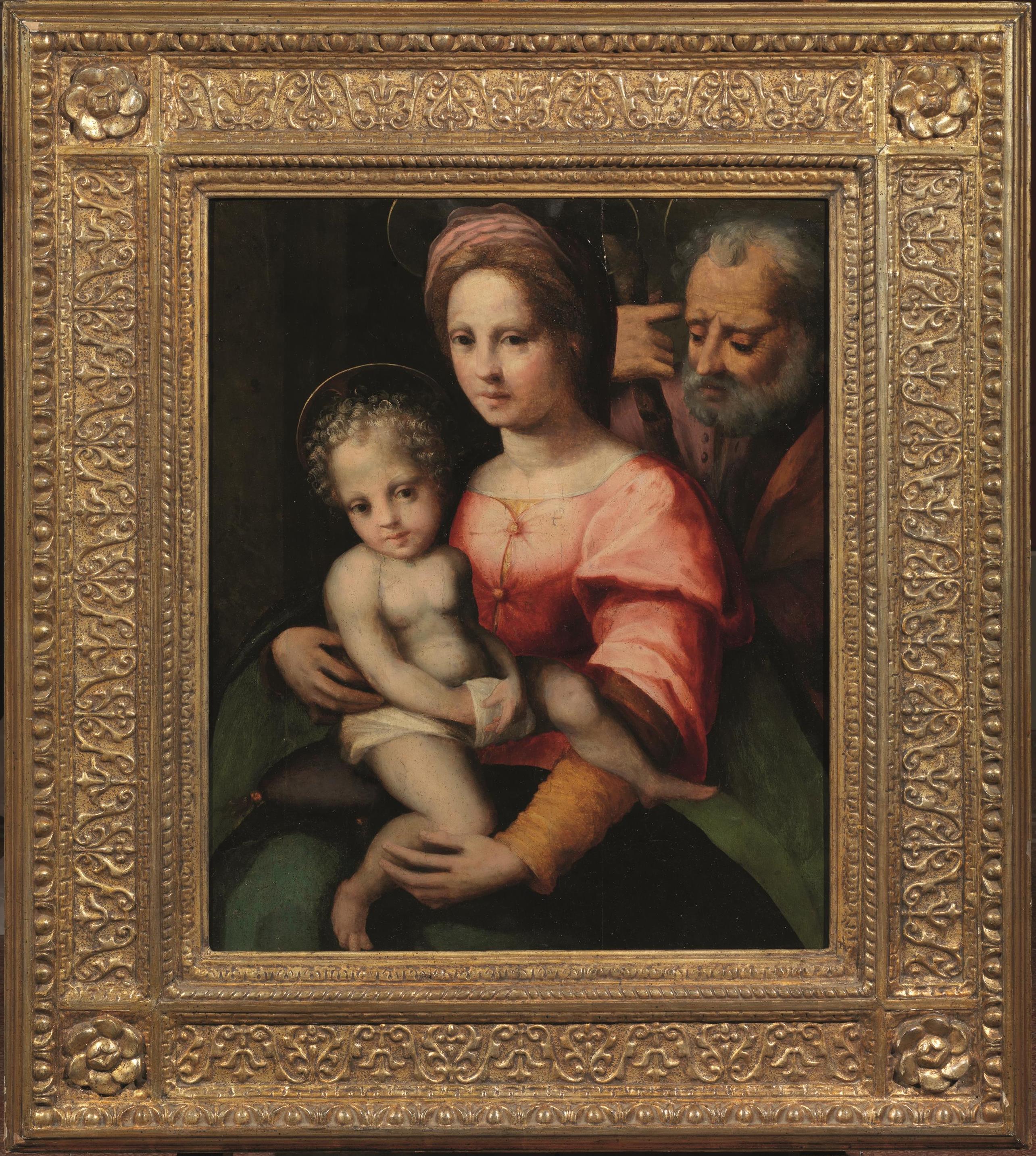 Questa Sacra Famiglia va inserita senza dubbio fra le opere autografe di Domenico Puligo, pittore fiorentino della prim’ora, contemporaneo del Pontormo e del Rosso, e lodato da Giorgio Vasari come il miglior allievo di Ridolfo del Ghirlandaio, sopra tutti gli altri “eccellente nel disegno e più vago e grazioso nel colorito”. Il discepolato presso Ridolfo è subito visibile in alcuni elementi dell’opera quali la composizione arcaica delle figure, ripresa ed elaborata su modelli fiorentini di inizio secolo raffaelleschi, della scuola di San Marco, e sarteschi. Un ricordo dello stile di Ridolfo è poi evidente nel disegno armonico del viso di Maria posto quasi a confronto con quello di Giuseppe, rugoso e segnato in ossequio ai Vangeli apocrifi che lo descrivono vecchio rispetto alla sposa fanciulla.