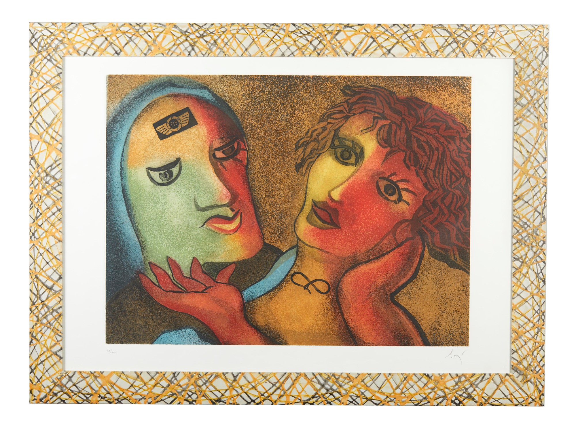 ENRICO BAJ (Milano 1924-Vergiate 2003) “Amanti”, 1990. Acquaforte e acquatinta a colori su carta. Cm foglio: 70x100. Opera firmata in basso a destra Baj. Reca numeri di tiratura in basso a sinistra 53/150. Reca etichetta Grafica d’Arte Lombardi, con timbro e firma.