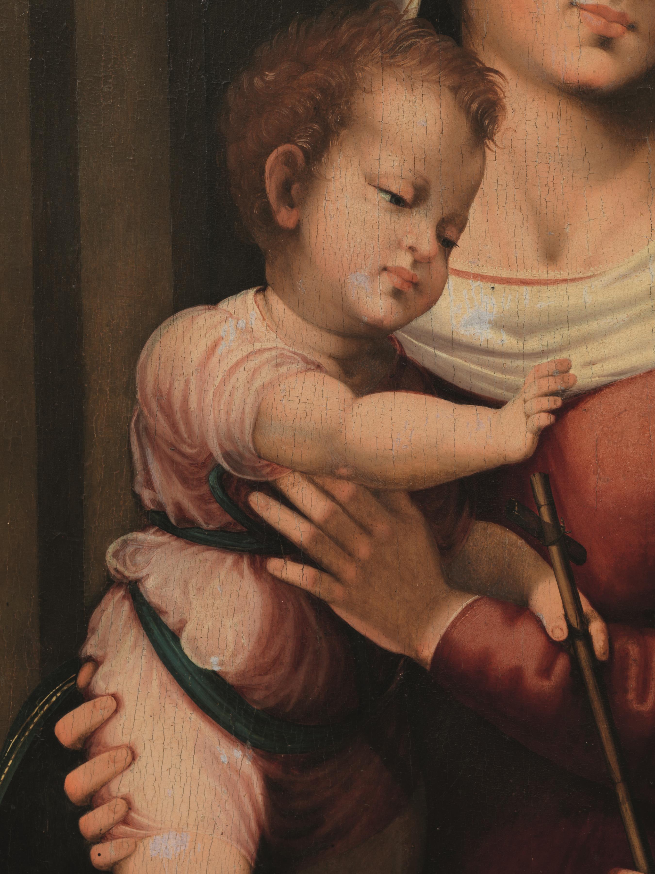 Proprio a tale maestro fiorentino, il cui nome ancora oggi ci sfugge, sarà da riferire questa tavola con la Madonna col Bambino e san Giovannino, le cui assonanze con le opere prime di quel pittore sono evidenti. Se Federico Zeri ricostruiva il corpus dell’artista partendo dalla pala d’altare con la Madonna in trono e santi della chiesa di Serumido (già di San Pier Gattolini) si deve a Serena Padovani (I ritratti Doni: Raffaello e il suo 'eccentrico' amico, il Maestro di Serumido, "Paragone", 56, 2005, 61, pp. 3-26) una precisa e complessa ricostruzione dell’artista e un primo tentativo di datazione delle sue opere a partire dall’attribuzione a lui delle scene a monocromo dipinte sul verso dei ritratti di Agnolo e Maddalena Doni di Raffaello. Già la fisionomia del Bambino appare quasi identica a quella usata nella pala della chiesa di Serumido. La fronte alta e bombata, il caratteristico taglio degli occhi a mandorla o le lumeggiature dei particolari anatomici caratterizzano in modo identico anche il Gesù della pala usata da Zeri per conferire un nome al pittore. Anche la posizione del Bambino in piedi sul grembo di Maria è la medesima e viene ripetuta nella pala d’altare di San Giusto ad Ema a bagno a Ripoli, dove il pittore sembra ancora più forzare i caratteri eccentrici del suo stile. Ulteriori confronti potranno essere svolti fra il curioso profilo sgusciato del san Giovannino con quello del san Sebastiano nell'Annunciazione della chiesa fiorentina di San Giuseppe, mentre il volto di Maria, seppur qui perfettamente ovale e armonico - quasi una reminescenza raffaellesca -, andrà paragonato con quello degli angeli dalla fronte ampia e tornita nelle due pale già citate della chiesa di Serumido e di San Giusto ad Ema, ma ormai deformate secondo stilemi caria anche a Berruguete.