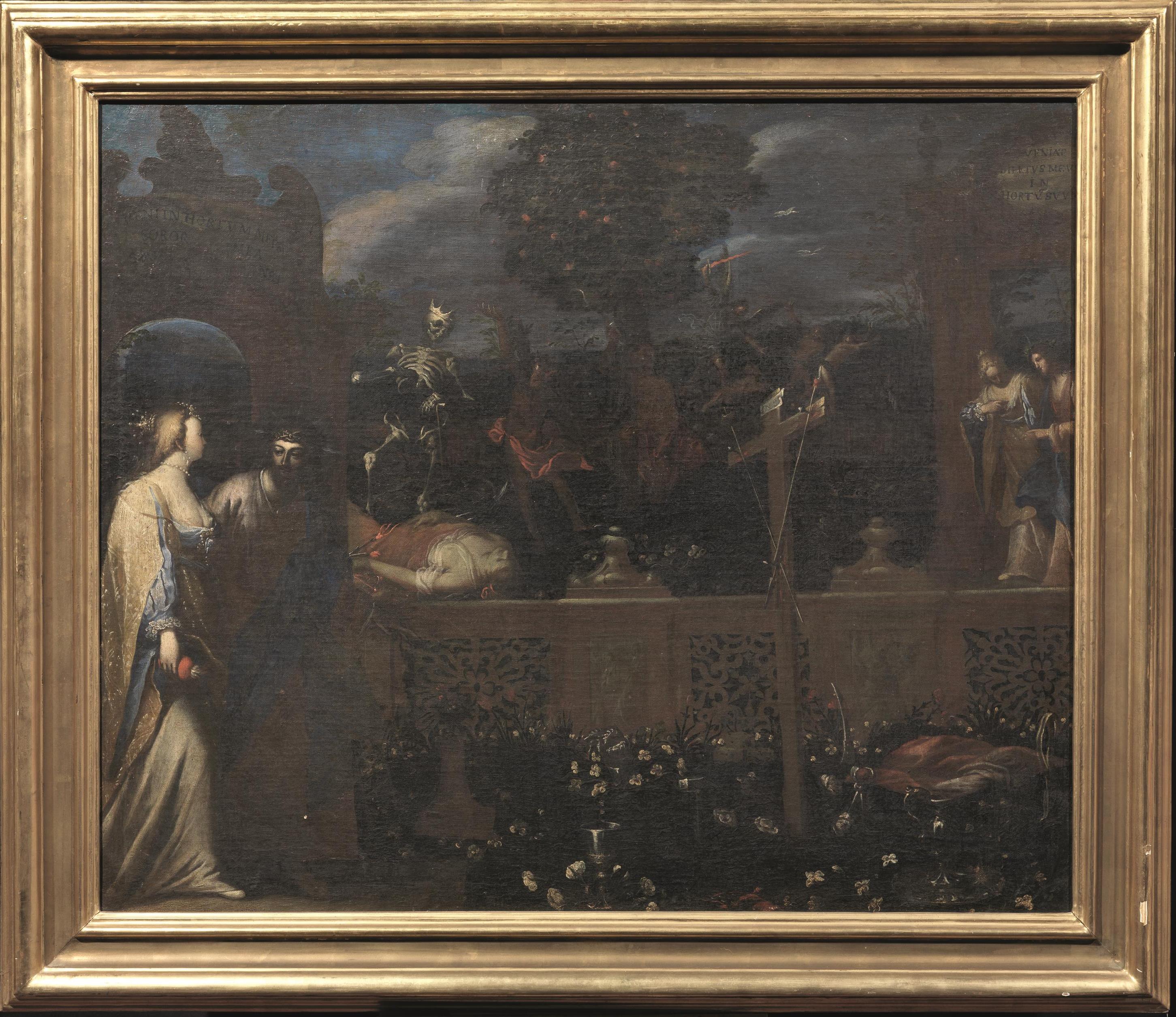 Sulle due arcate a destra e a sinistra del dipinto sono riportate le seguenti iscrizioni: "Veniat dilectus meus in hortum suum" e "Veni in hortum meum soror mea sponsa" tratte dal Capitolo V, 1-3 del Cantico. La nostra tela costituisce pertanto una sorta di trasposizione in pittura di questi passi, vediamo infatti sulla destra del dipinto che la Sposa conduce lo Sposo, ovvero Cristo, nel suo giardino per mostrargli i frutti. All'interno del giardino, che viene rappresentato dal pittore come una sorta di hortus conclusus, si ritrova il simbolo del peccato espresso attraverso la rappresentazione della Cacciata dei Progenitori; al centro, a indicare il piacere carnale, due satiri che bevono il vino; e infine il trionfo della morte rappresentata come uno scheletro incoronato che si erge sul corpo esangue di una giovane fanciulla distesa sul prato.