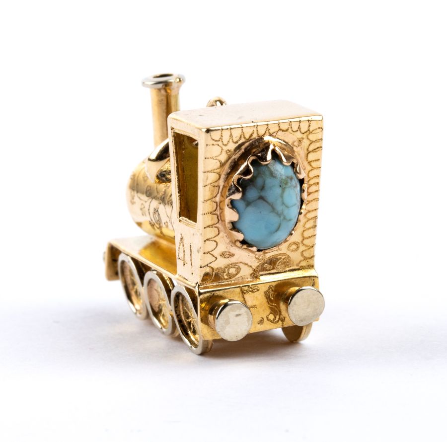 in oro giallo, un pendente a forma di anfora ed uno raffigurante una locomotiva, decorati con paste vitree.