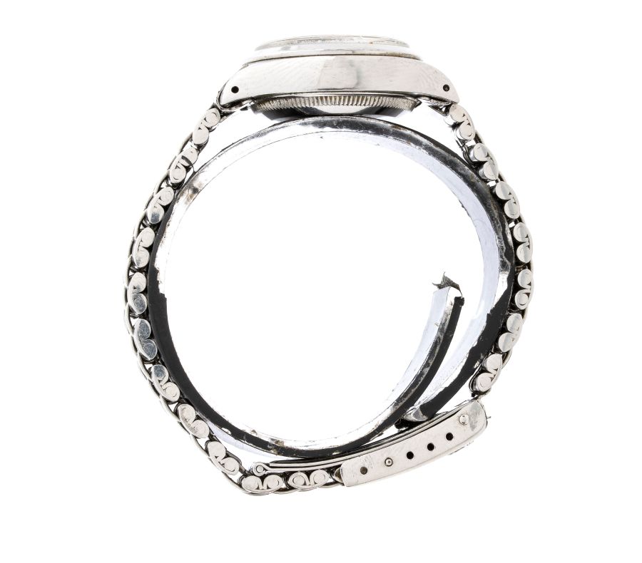 con cassa e bracciale Jabilee in acciaio, quadrante argentè con indici a sfera, datario ore 3, vetro plastica. Movimento meccanico automatico. Calibro 2030, referenza 6916, matricola 3.765.031.