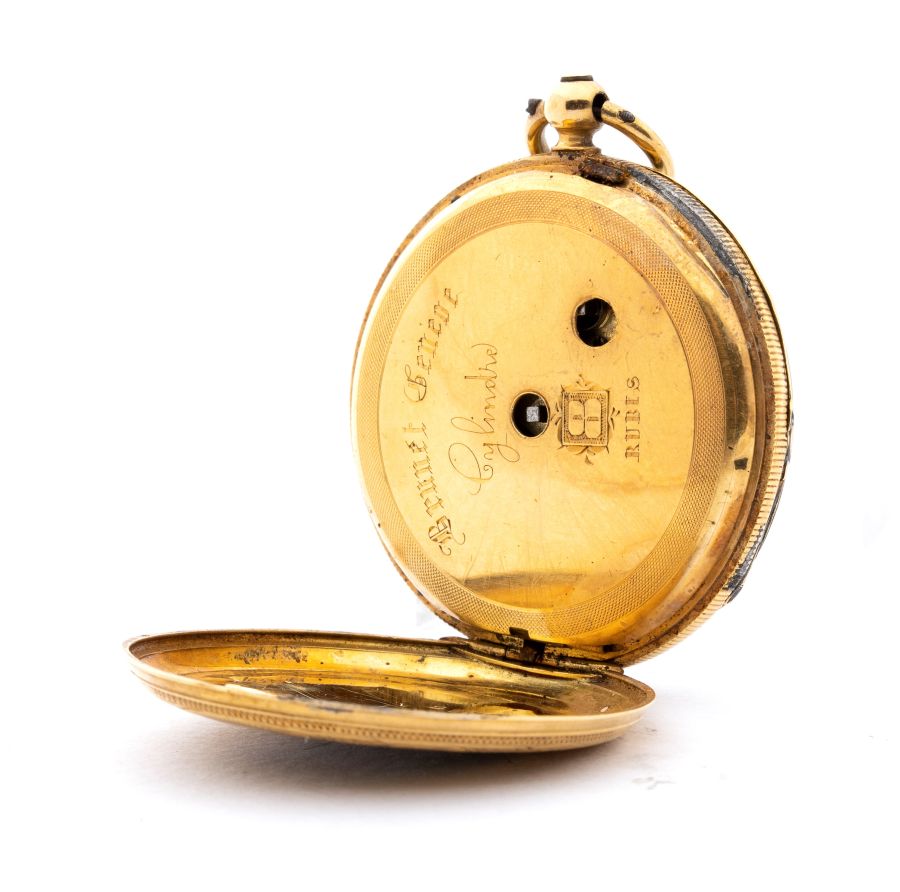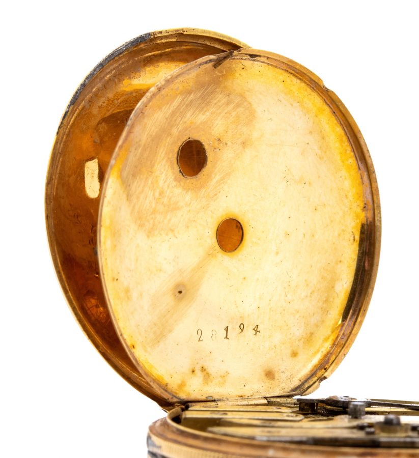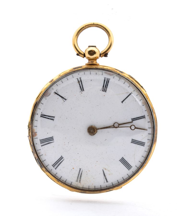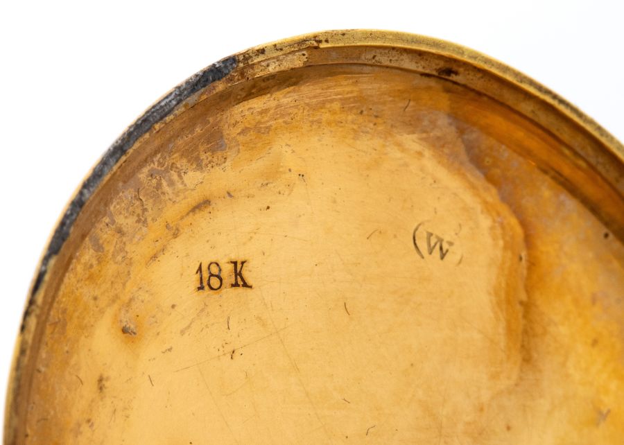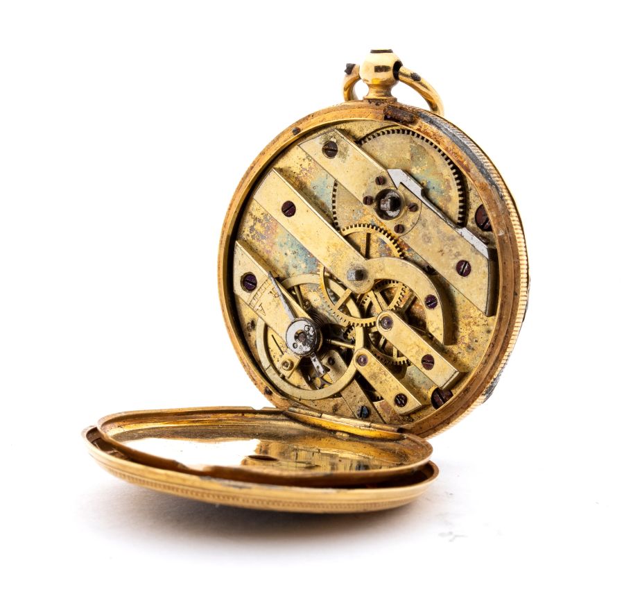 cassa in parte in metallo, in parte smaltata, con chiavetta di carica in oro, quadrante bianco ceramica con indici romani e sfere breguet. Movimento a carica manuale a chiavetta con scappamento a cilindro.