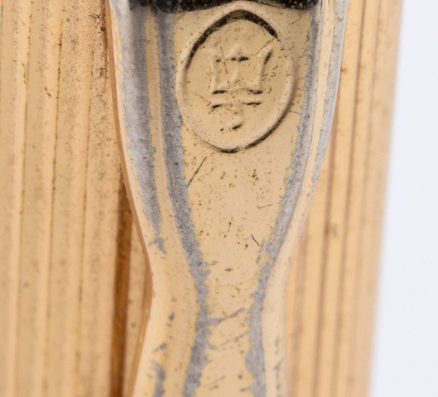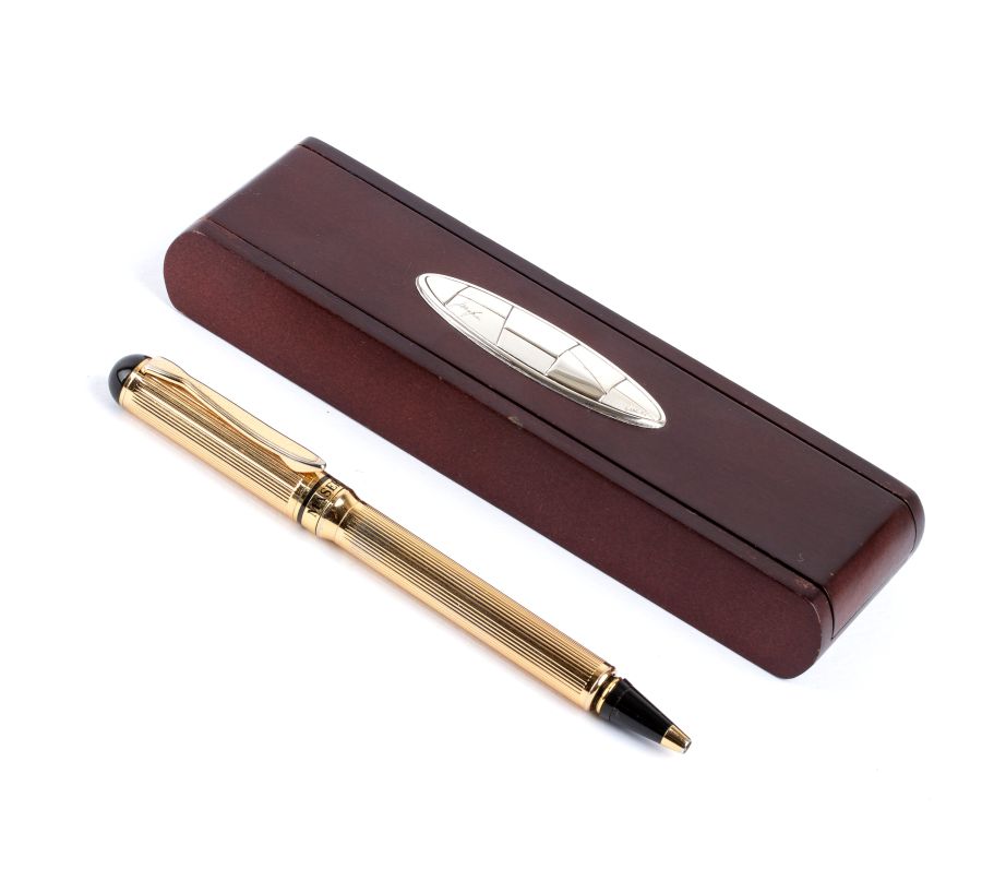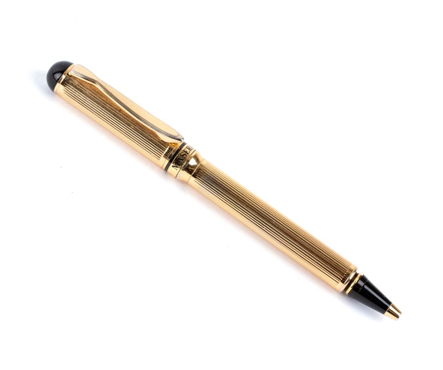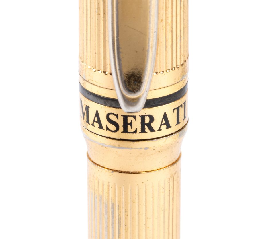 Lunghezza: 13,9 cm. Peso: 35,4 gr. Lunghezza: 13,9 cm. Peso: 35,4 gr. realizzato in metallo con una raffinata finitura dorata. La punta fuoriesce ruotando la parte superiore. Al centro della penna è presente la firma Maserati in nero.