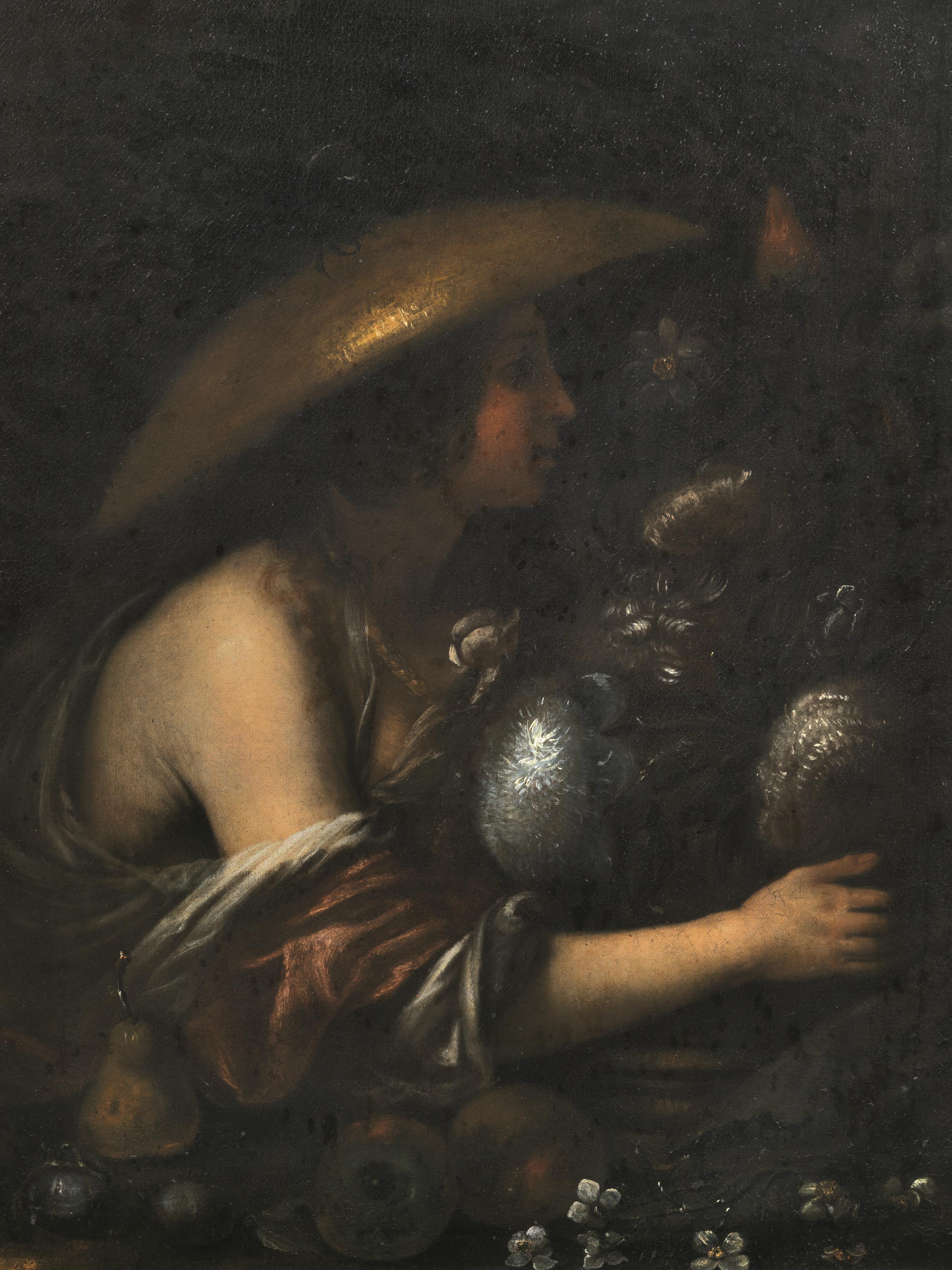 L’opera qui proposta, raffigurante Fanciulla con natura morta autunnale, di Francesco Montelatici detto Cecco Bravo, artista dalla natura anti-accademica e irregolare, presenta elementi tipici della sua produzione, caratterizzata da una pittura morbida e sensuale in cui la materia sfumata accentua l'atmosfera misteriosa e incantata. I singoli elementi del nostro dipinto emergono infatti dalla penombra: la luce lambisce il braccio e la spalla della giovane donna, il suo curioso copricapo, i fiori tra le sue braccia realizzati con piccoli tocchi di colore, il cavolfiore in primo piano sulla destra e la torre sullo sfondo. Tali aspetti lirici venivano messi in evidenza da Carlo Del Bravo che per primo rendeva nota l'opera, descrivendola “tutta soffusa di metamorfosi su una situazione sentimentale crepuscolare e d'attesa, con un lento abbraccio da sogno a un mazzo di pigre accensioni – come di crisantemi nella sera -, qualche disponibile grano di dolcezza – come di fichi e pere d’ottobre - , e un autonomo sviluppo misterioso, scuro eppur amico – come di un grande cavolfiore che sul terriccio diventi una luna velata, una piovra grande”.