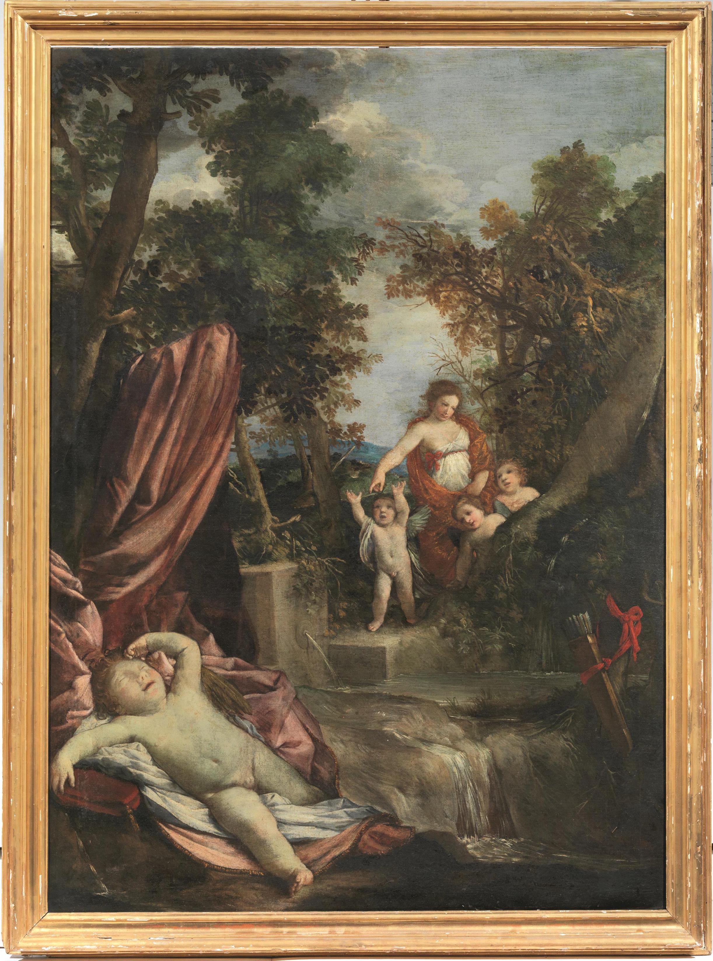 Scuola emiliana, sec. XVIIIAMORE DORMIENTE CON DIANA IN UN PAESAGGIOolio su...