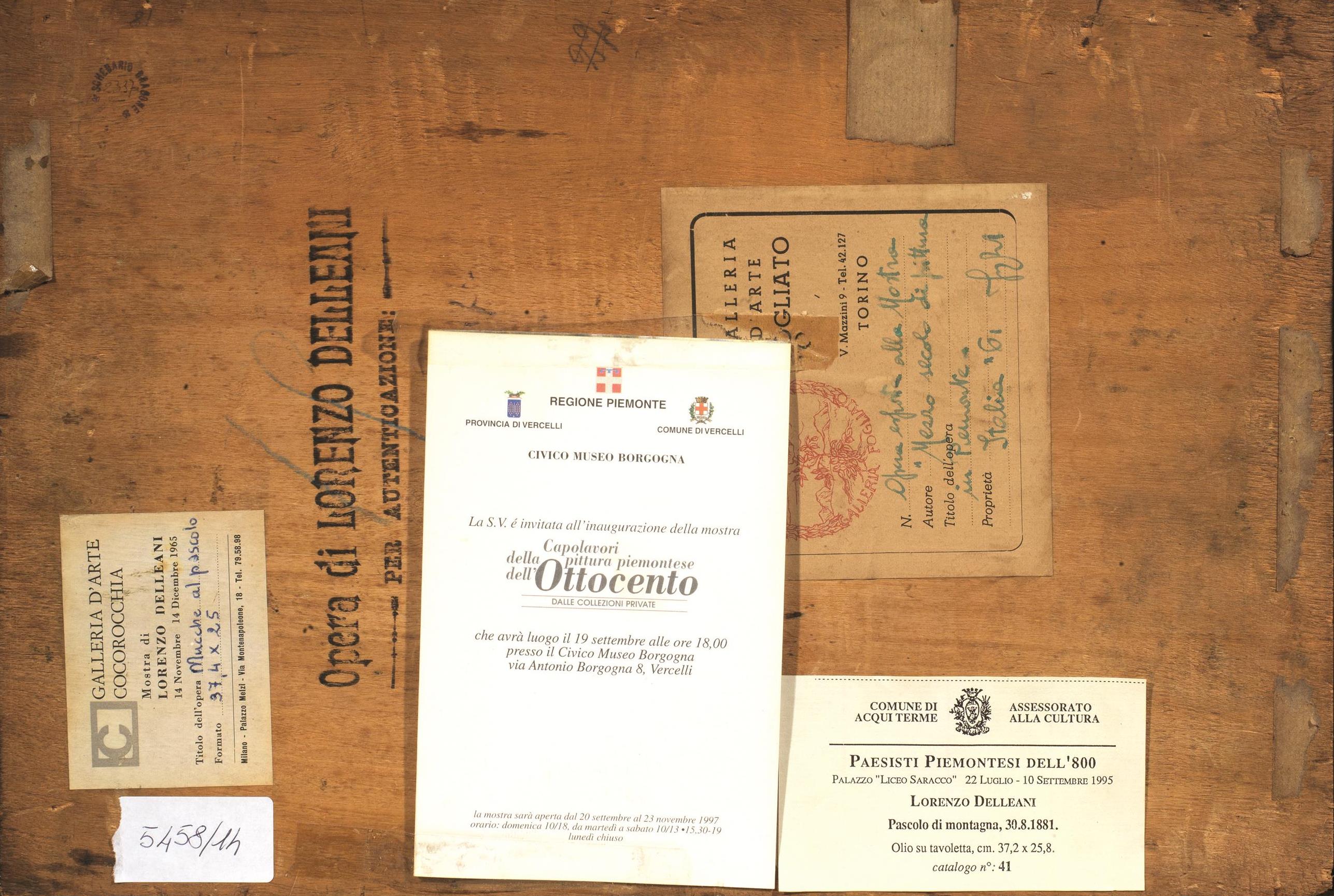 sul retro: etichette Galleria d'Arte Fogliato, Galleria d'Arte Corocchia, Mostra paesisti piemontesi dell'Ottocento, Mostra capolavori della pittura piemontese dell'Ottocento, timbro Opera di Lorenzo Delleani, Bistolfi