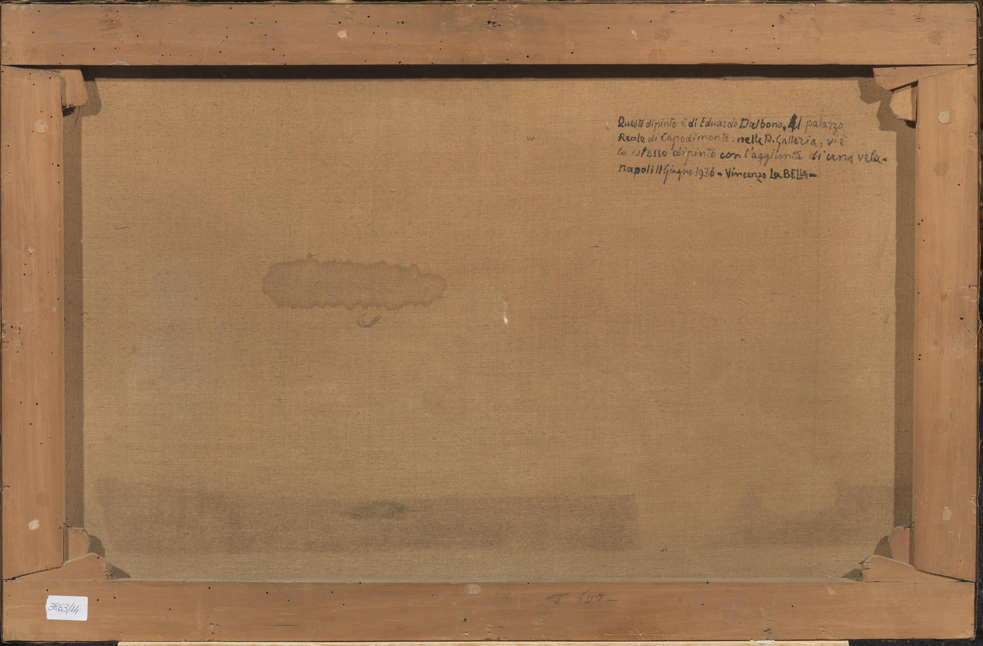 sul retro: iscrizione "Questo dipinto è di Eduardo Dalbono, al Palazzo Reale di Capodimonte nella R. Galleria, vi è lo stesso dipinto con l'aggiunta di una vela. Napoli, 11 giugno 1936, Vincenzo La Bella"