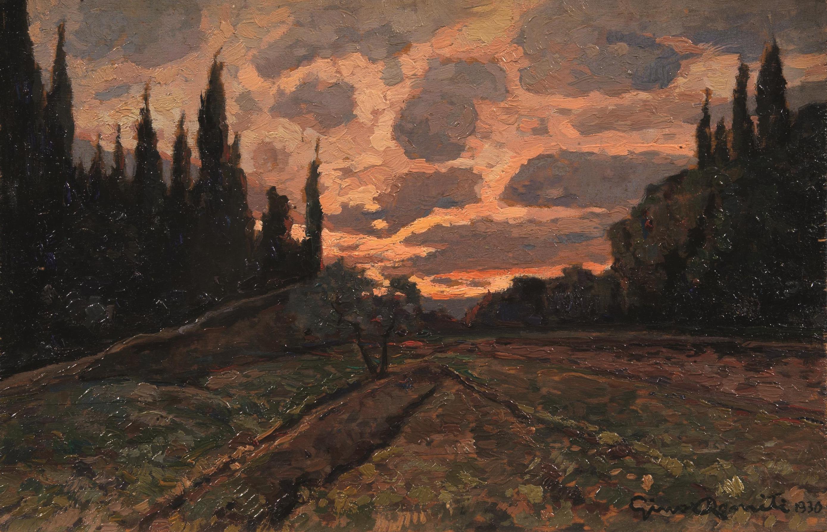 Gino Romiti(Livorno 1881 - 1967)CAMPAGNA AL TRAMONTOolio su compensato, cm...
