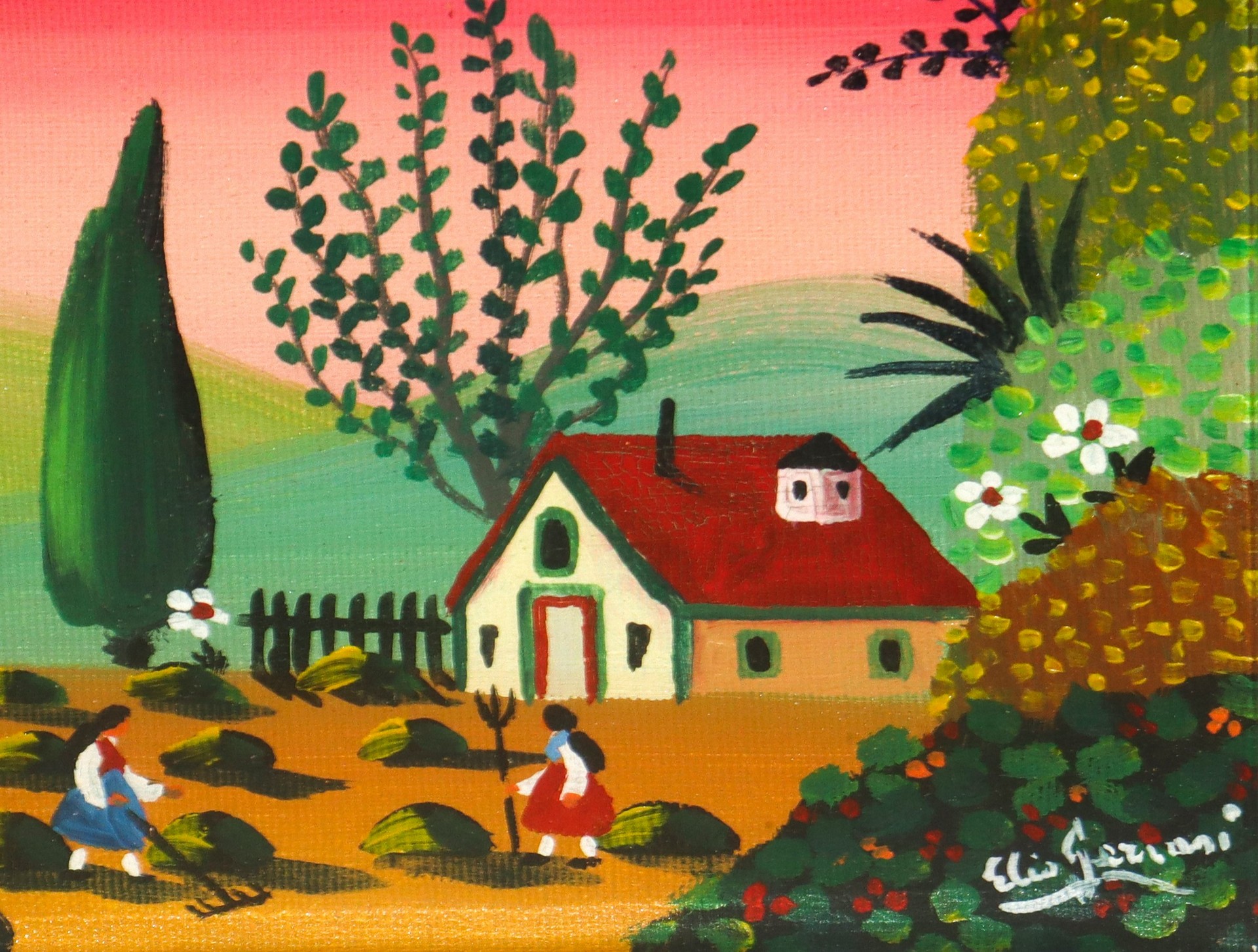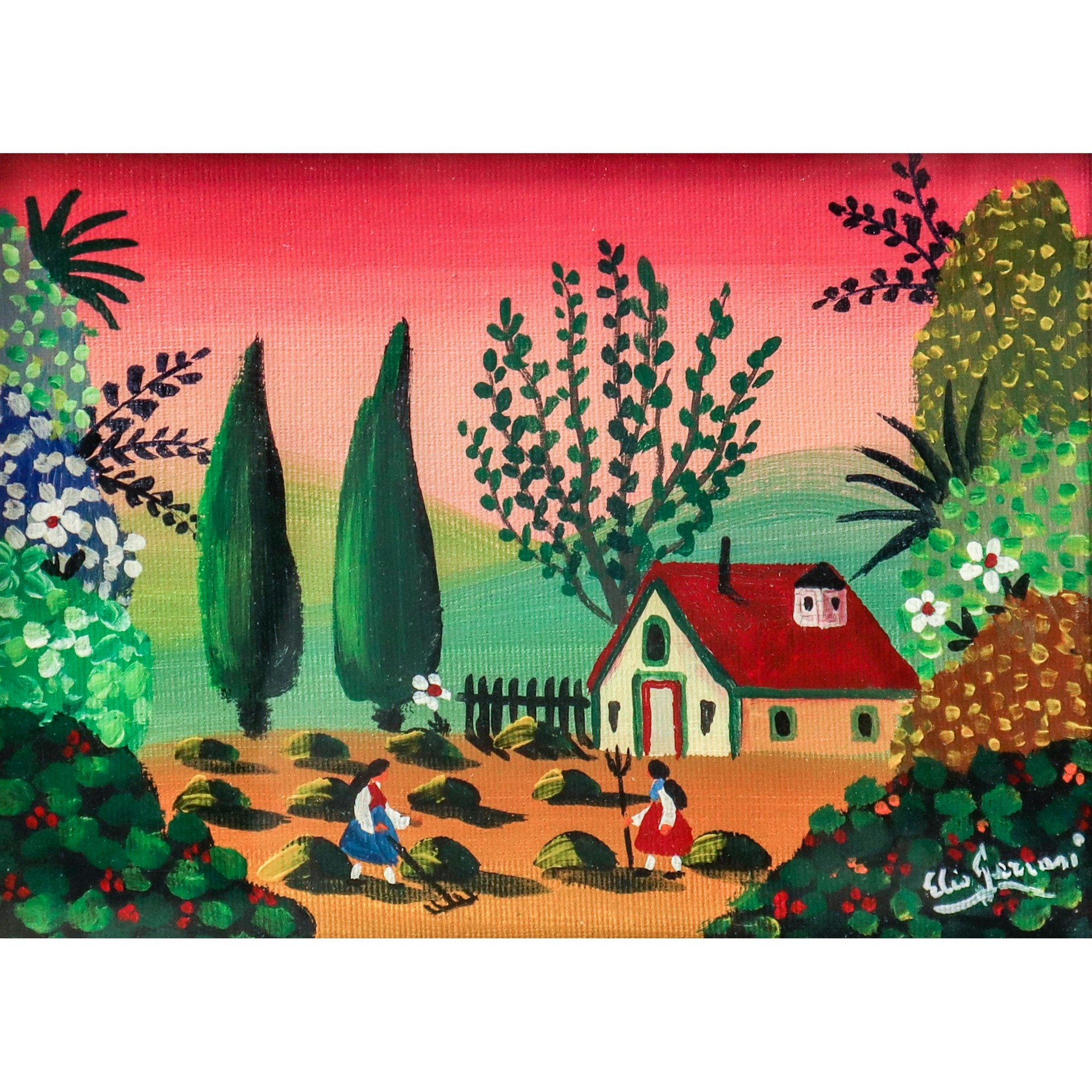 Elio Gervasi (XX secolo) - Contadine Taormina, 1986 h cm 17,5X24 in cornice 36,5X42 olio su tela Firmato titolato e datato sul retro. Firmato in basso a destra