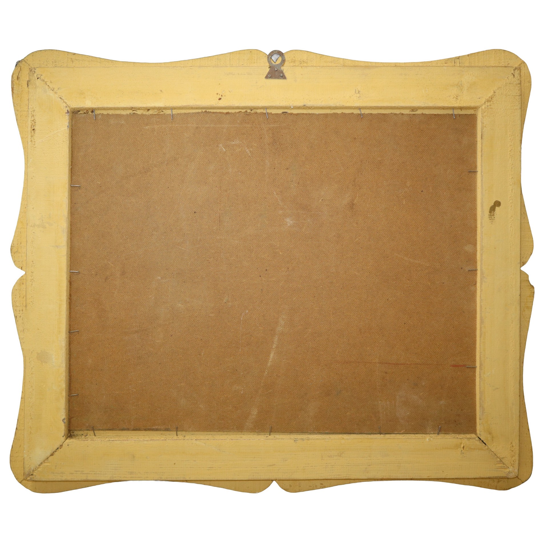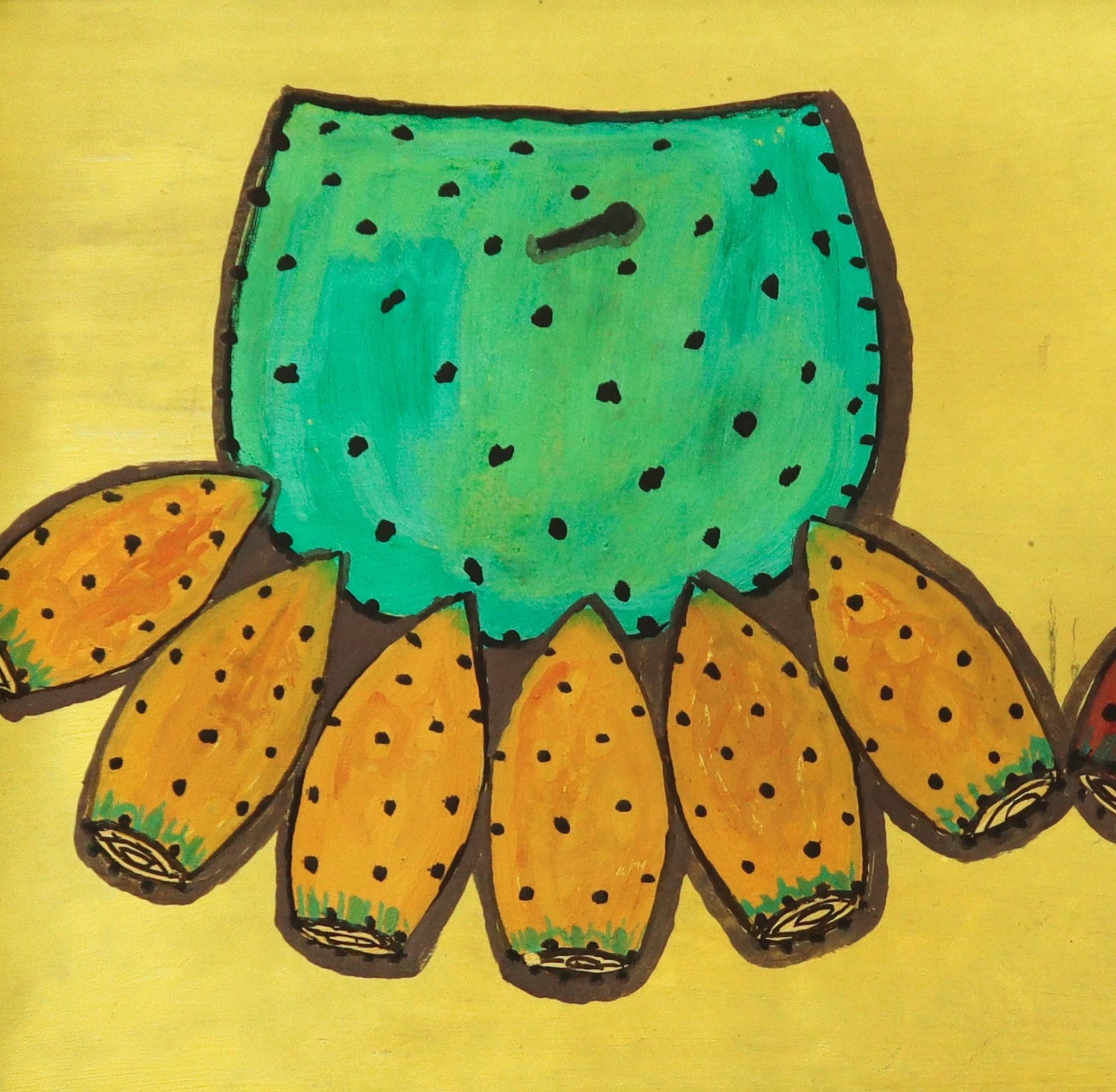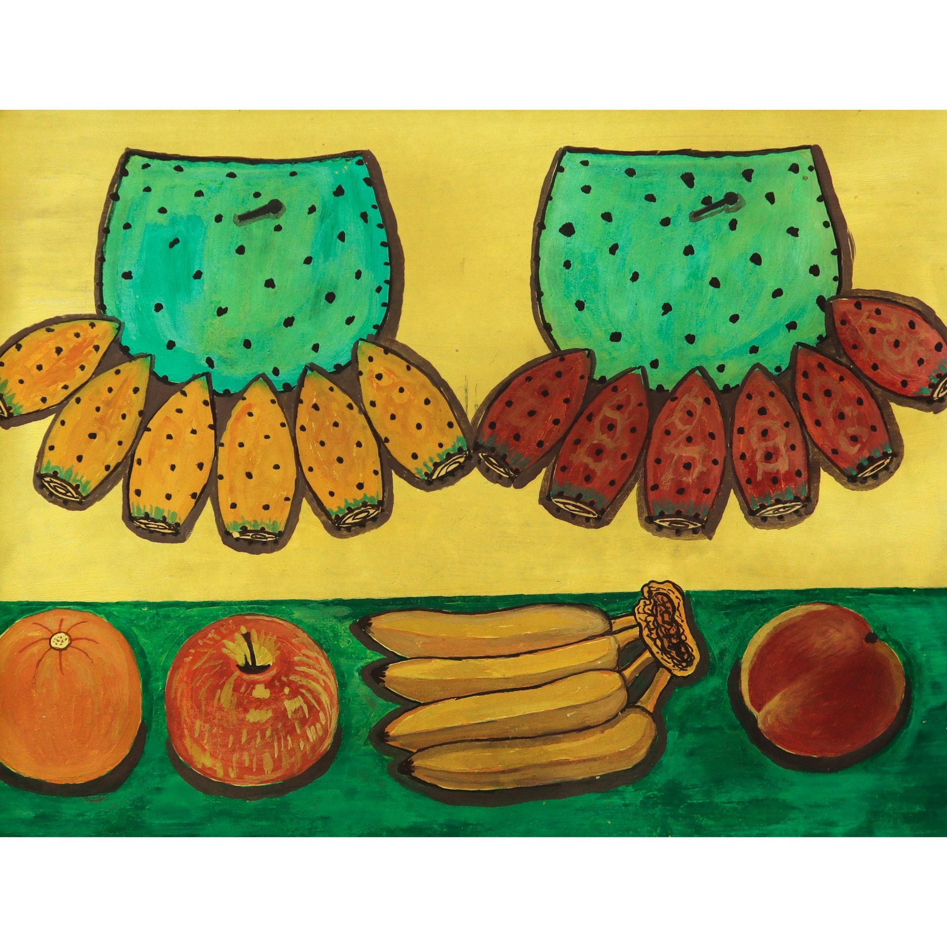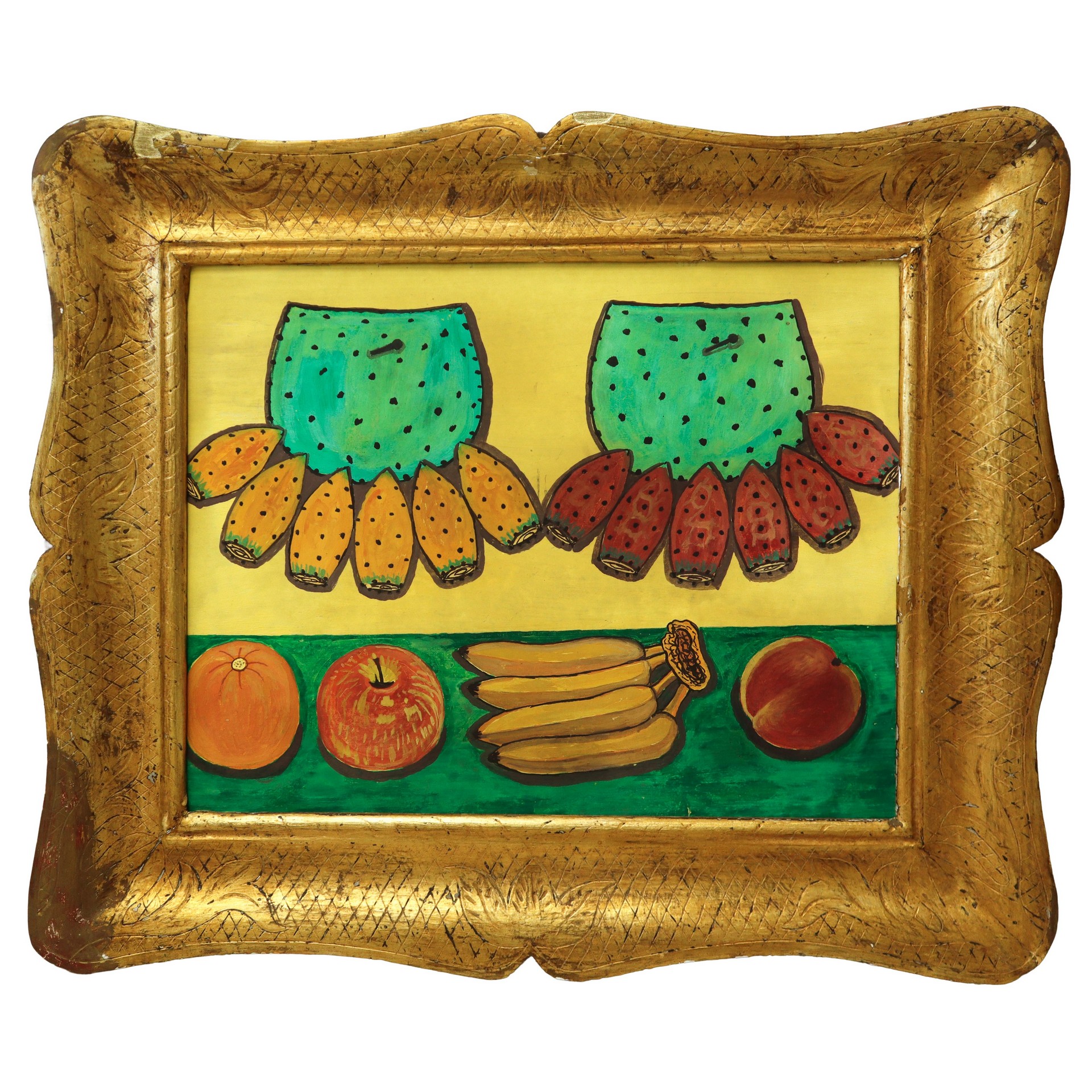 Fichi d'india, banane e frutta h cm 40X50 in cornice h cm 57X67 olio su masonite Dipinto Naif in cornice dorata a vassoio
