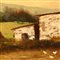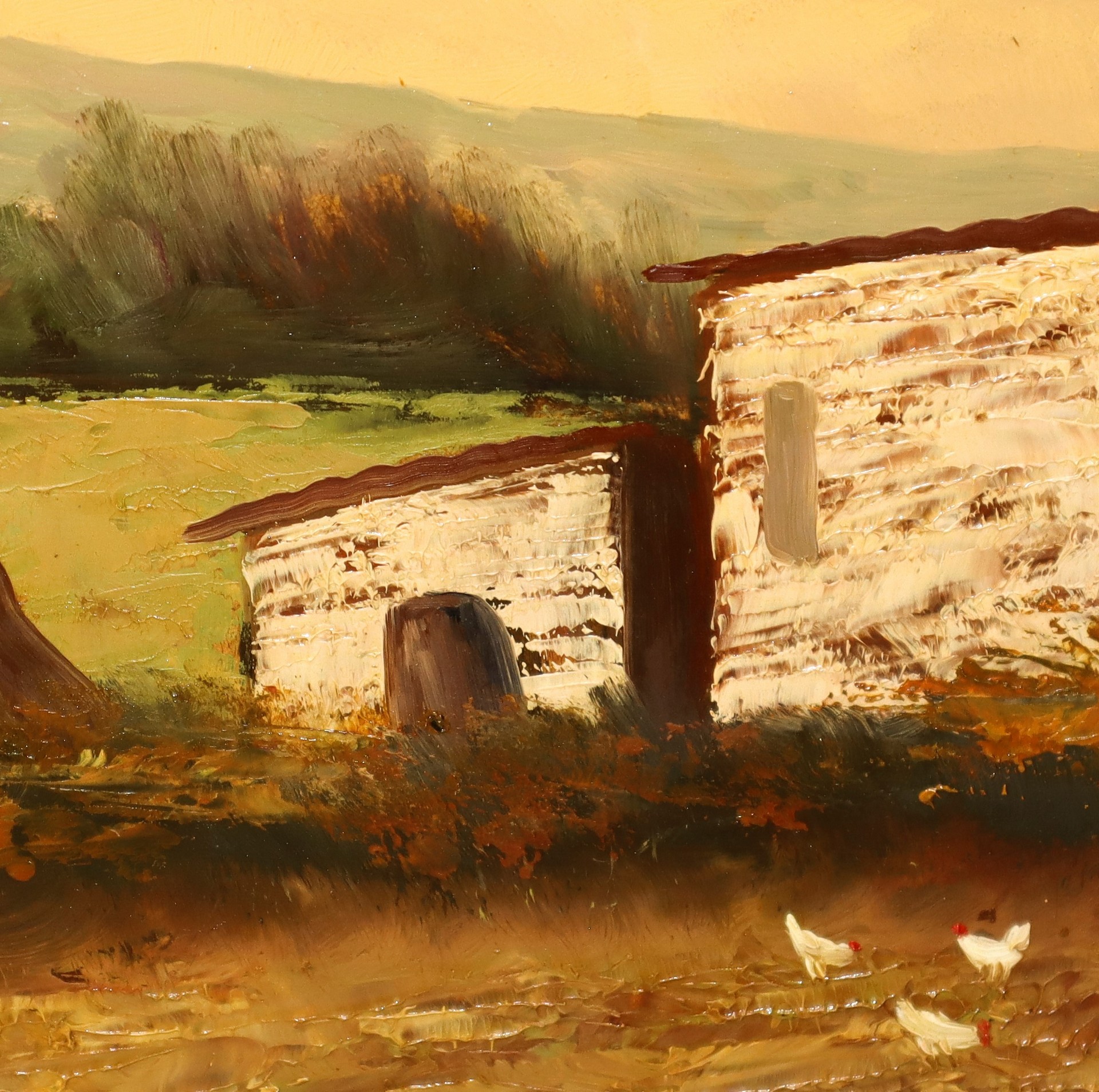 Paesaggio con case e covone di fieno e galline cm 35x50 in cornice cm 49x64 Olio su masonite Firmato Guido Pino