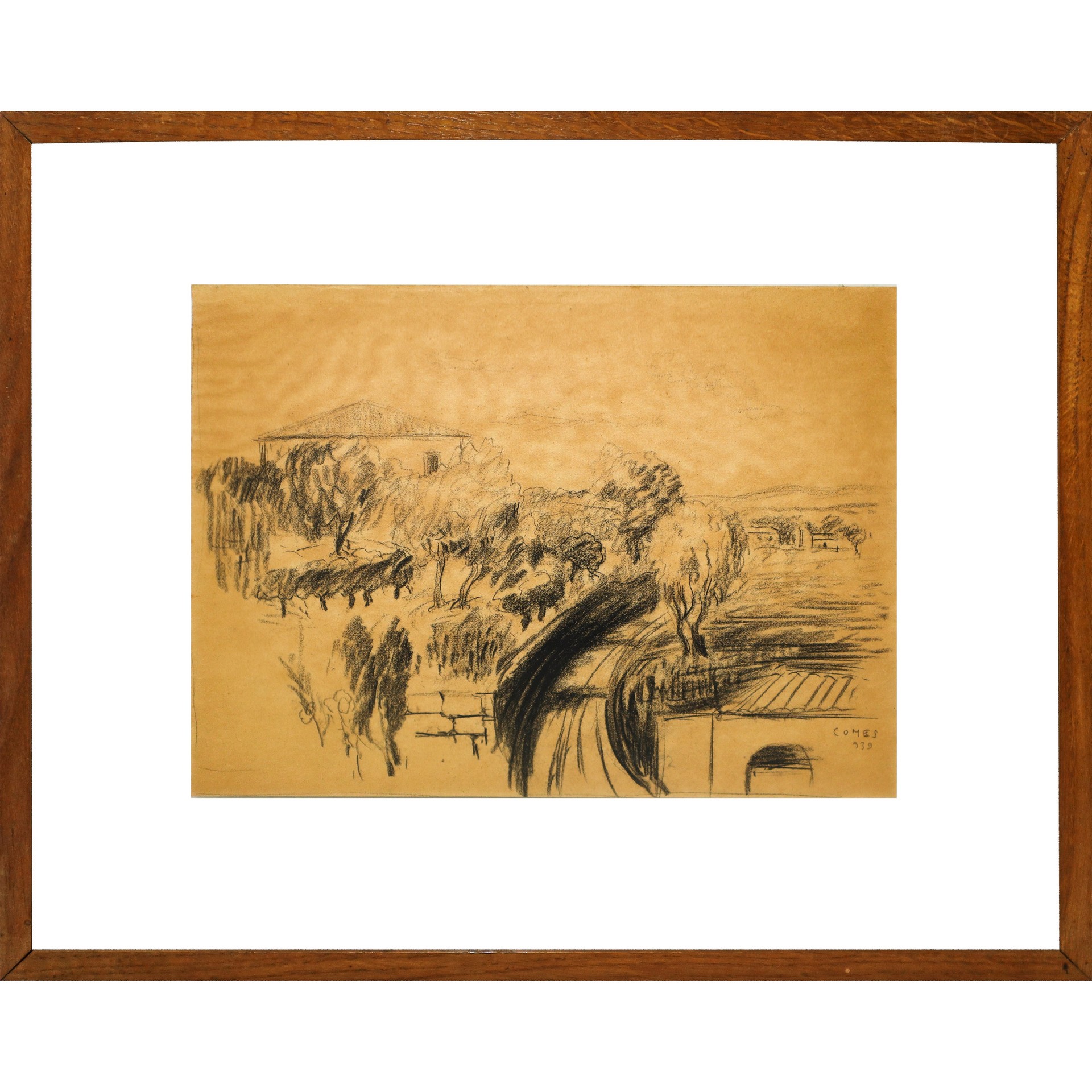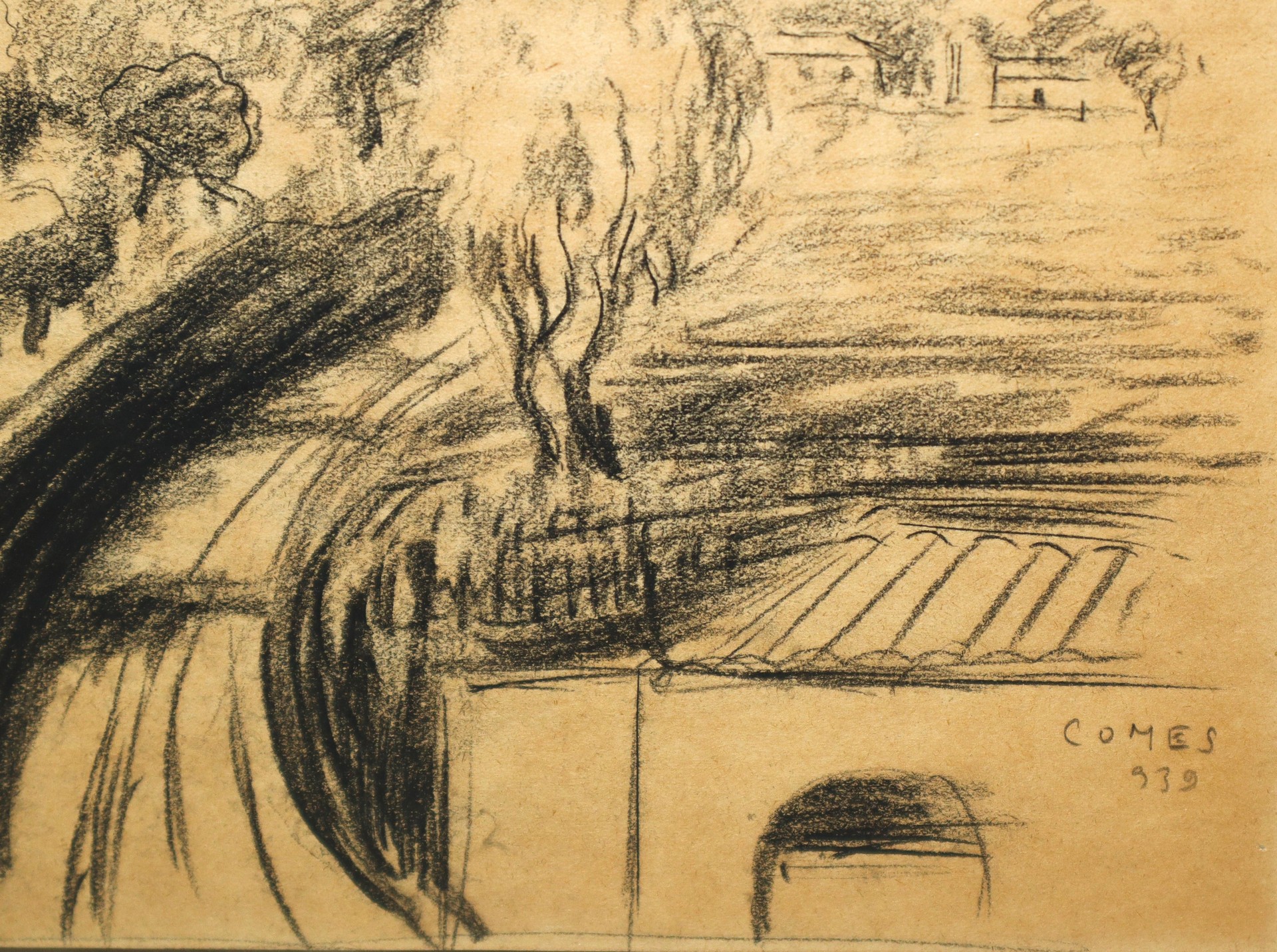 Carmelo Comes (Catania 1905 - Catania 1988) - Paesaggio, 1939 H cm 22,5x29,5 - in cornice H cm 38x46 Disegno a carboncino Firmato in basso a destra e datato