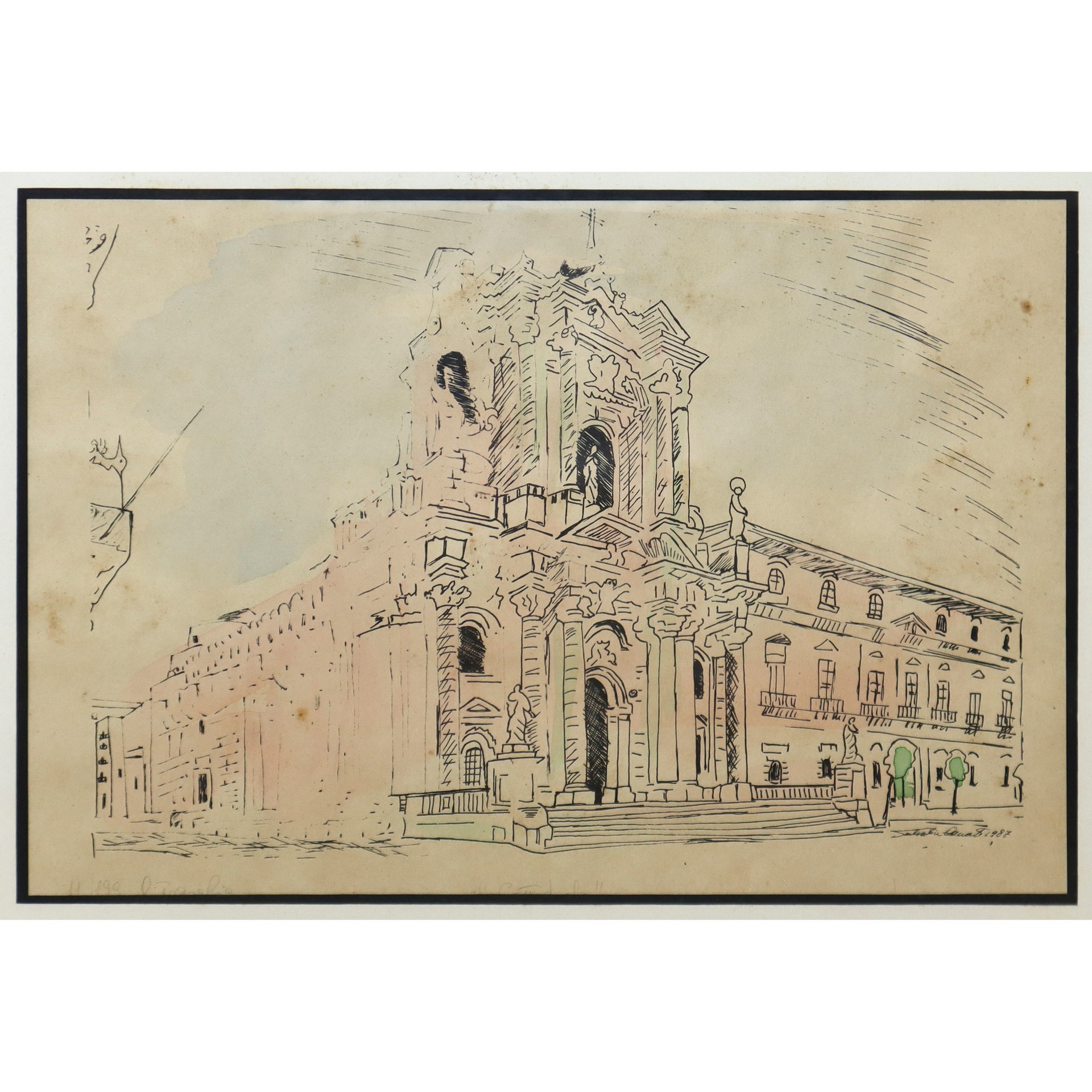 Coppia di disegni acquerellati raffiguranti Teatro Greco e Cattedrale Santa lucia di Siracusa, Firmato Salvatore Amato