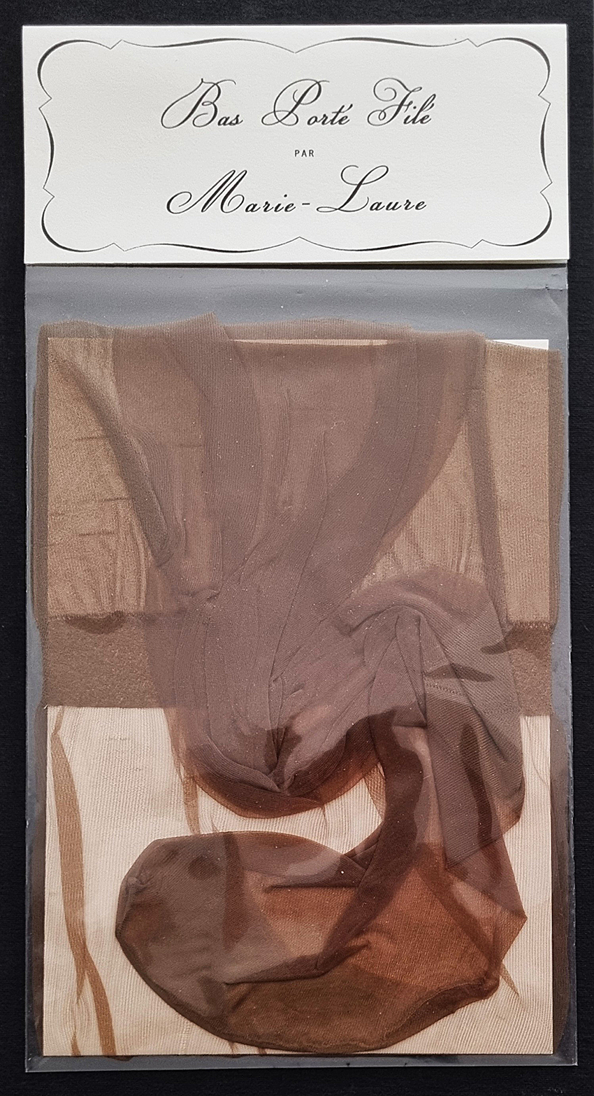 BERQUET GILLES Francia 1956 "Bas porté filé par Mïrha Lugosi" Calze in nylon contenute in confezione sigillata cm 13x31. Firmate al verso. Collezione di moda per le modelle del fotografo Gilles Berquet. Edizione limitata "La Maison Fimoin".