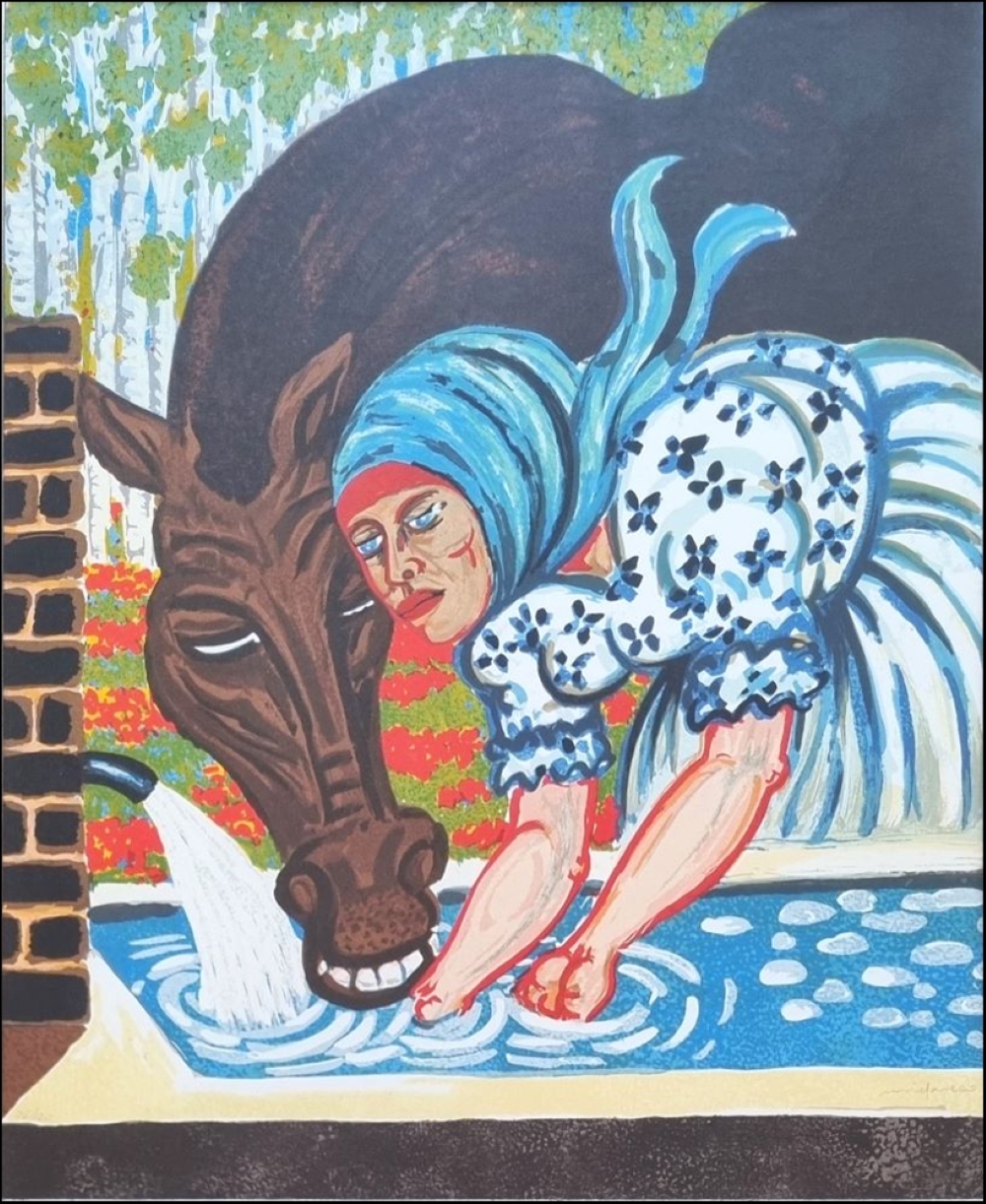 MIGNECO GIUSEPPE Messina 1903 - Milano 1997 "Senza titolo" Serigrafia su tela cm 56x70. Firmata sul fronte in basso a destra, tiratura 76/120 a sinistra.