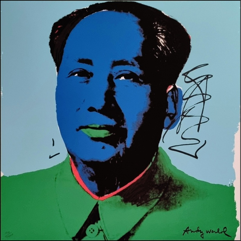WARHOL ANDY Pittsburgh 1928 - New York 1987 "Mao Tse-tung" Riproduzione litografica offset su cartoncino cm 60x60. Firmata in stampa sul fronte in basso a destra, tiratura a matita a sinistra. Sul retro timbro Edizioni CMOA e ologramma di autenticità.