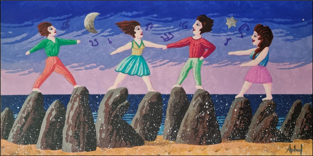 APHEL FABIO Cavalese (TN) 1957 "Ballo notturno" Olio su tavola cm 40x20. Firmato sul fronte in basso a destra. Al verso firma e titolo.