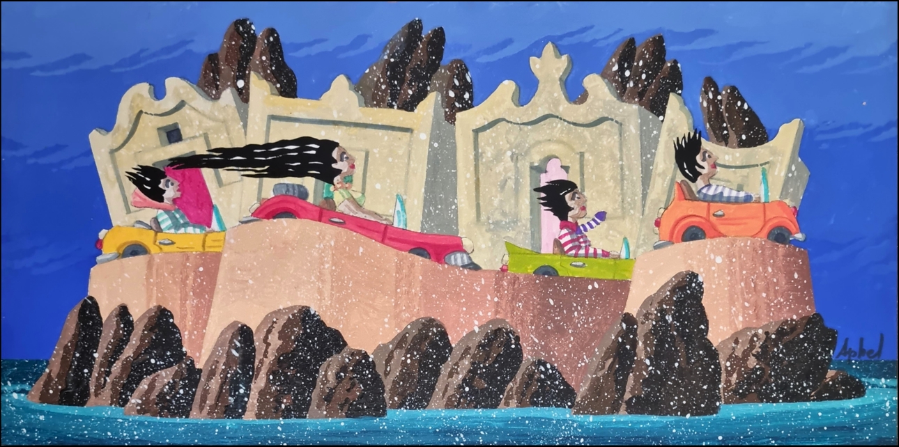 APHEL FABIO Cavalese (TN) 1957 "La corsa automobilistica" Olio su tavola cm 40x20. Firmato sul fronte in basso a destra. Al verso firma, titolo e misure.