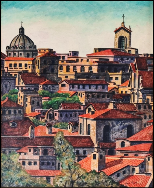 CAPUTO TONINO Lecce 1933 - 2021 "La torretta di Montecitorio" Olio su tela riportata su cartone, cm 50x60. Firmato sul fronte in basso a destra. Al retro titolo, firma, dedica ad personam e timbro della galleria Artenova. Certificato di garanzia di altra casa d'aste.