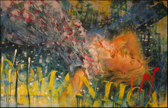 DELVECCHIO MAURIZIO Basilea 1962 "Romantica" Olio su tela cm 110x70. Firmato sul fronte in basso a sinistra. Autentica su foto del Maestro.